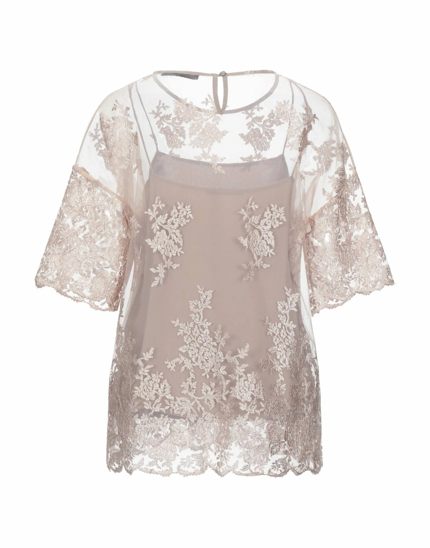 lace, no appliqués, solid color, rear closure, button closing, short sleeves, round collar, no pockets, side slit hemline, 2-piece set