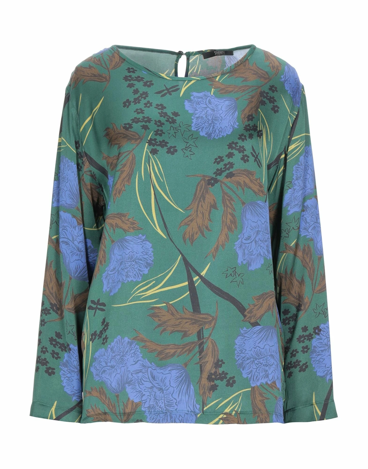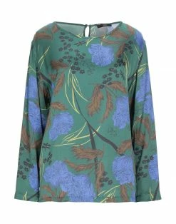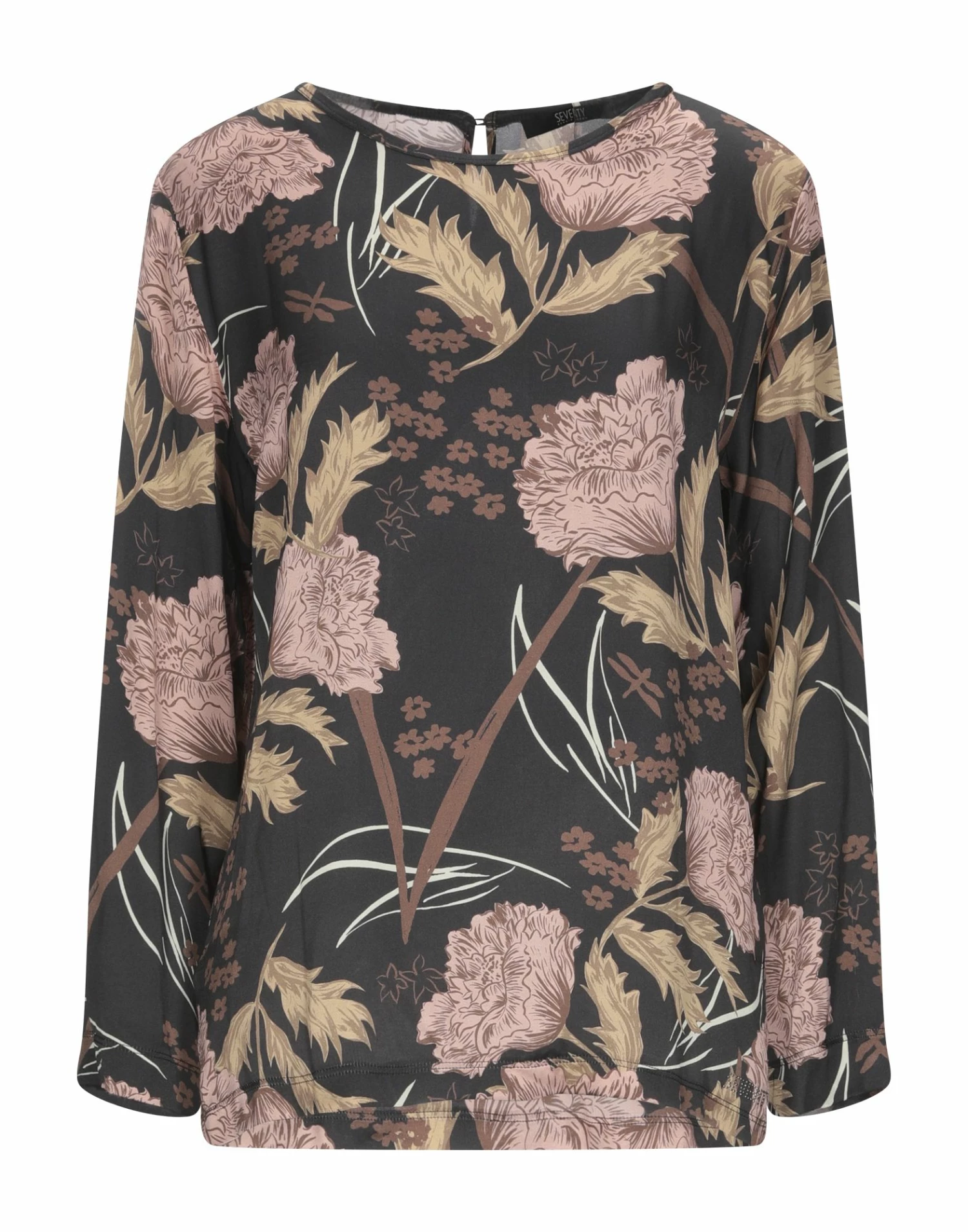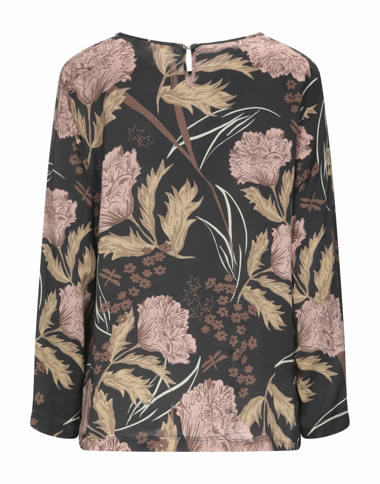 satin, logo, floral design, rear closure, button closing, long sleeves, round collar, no pockets, side slit hemline, contains non-textile parts of animal origin