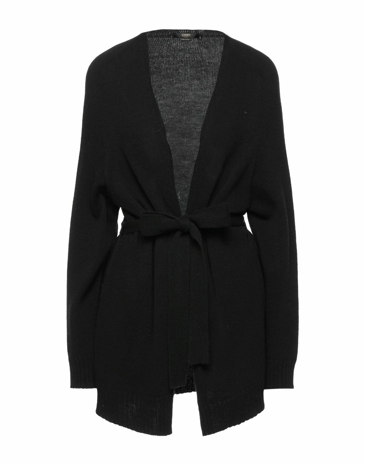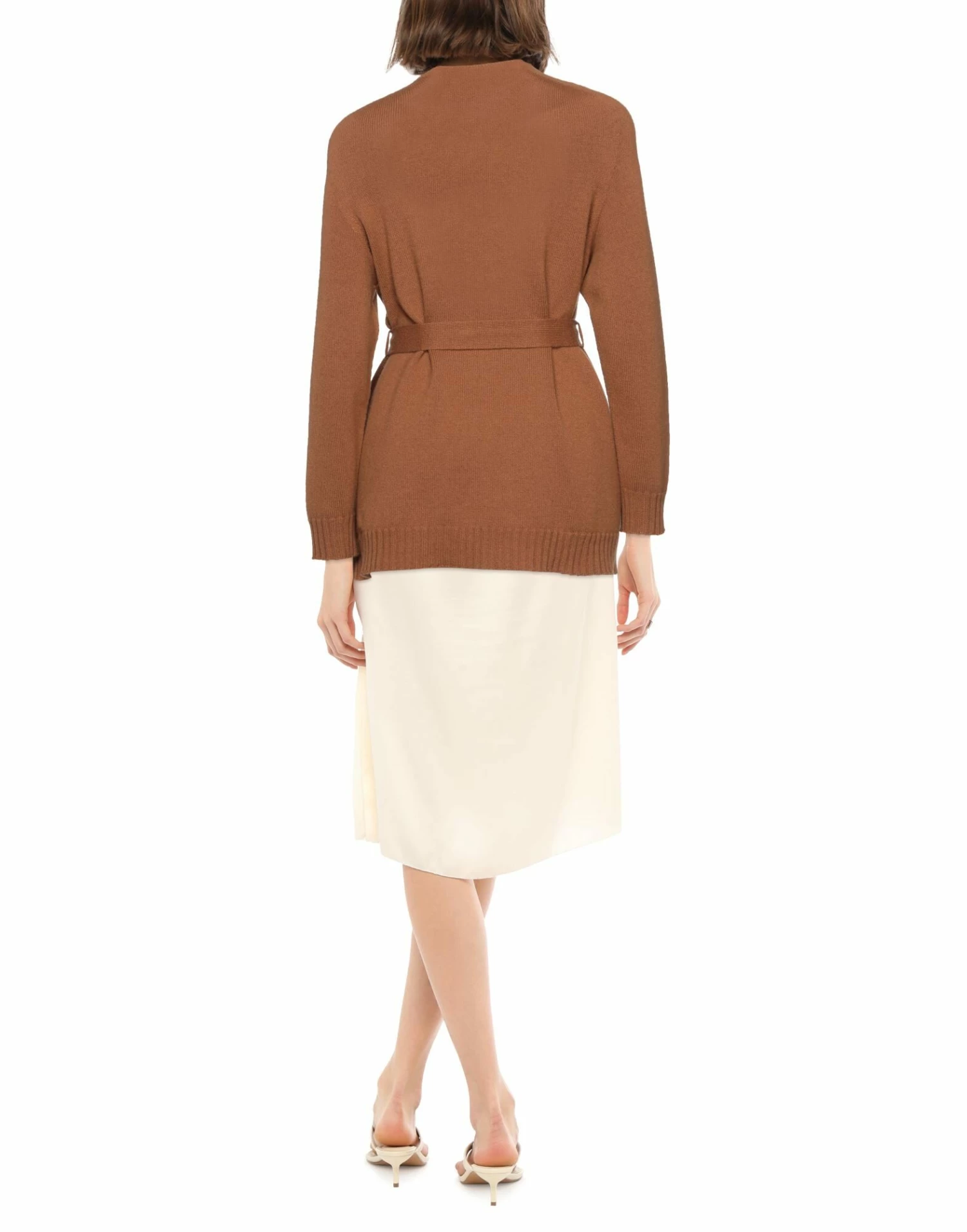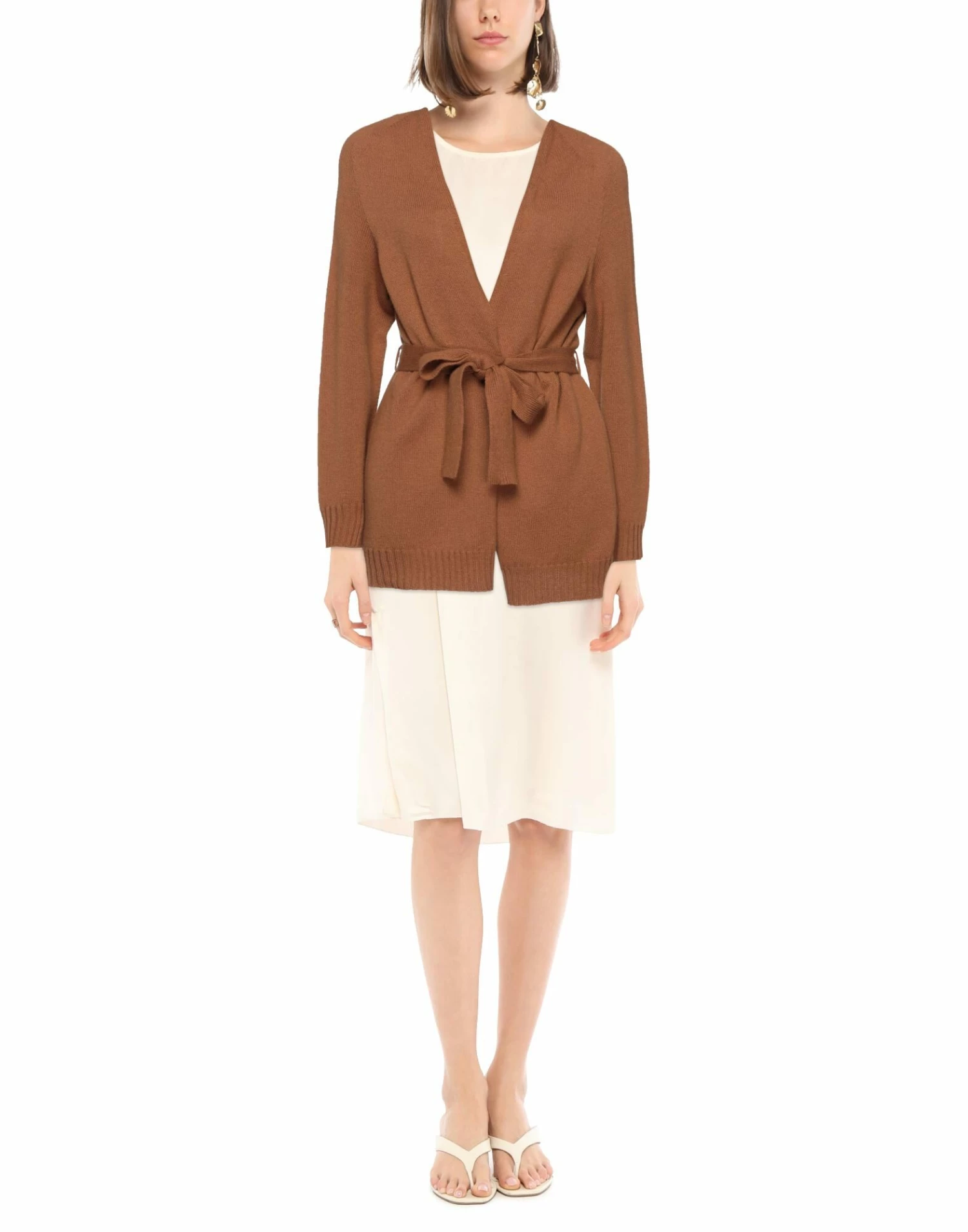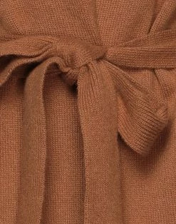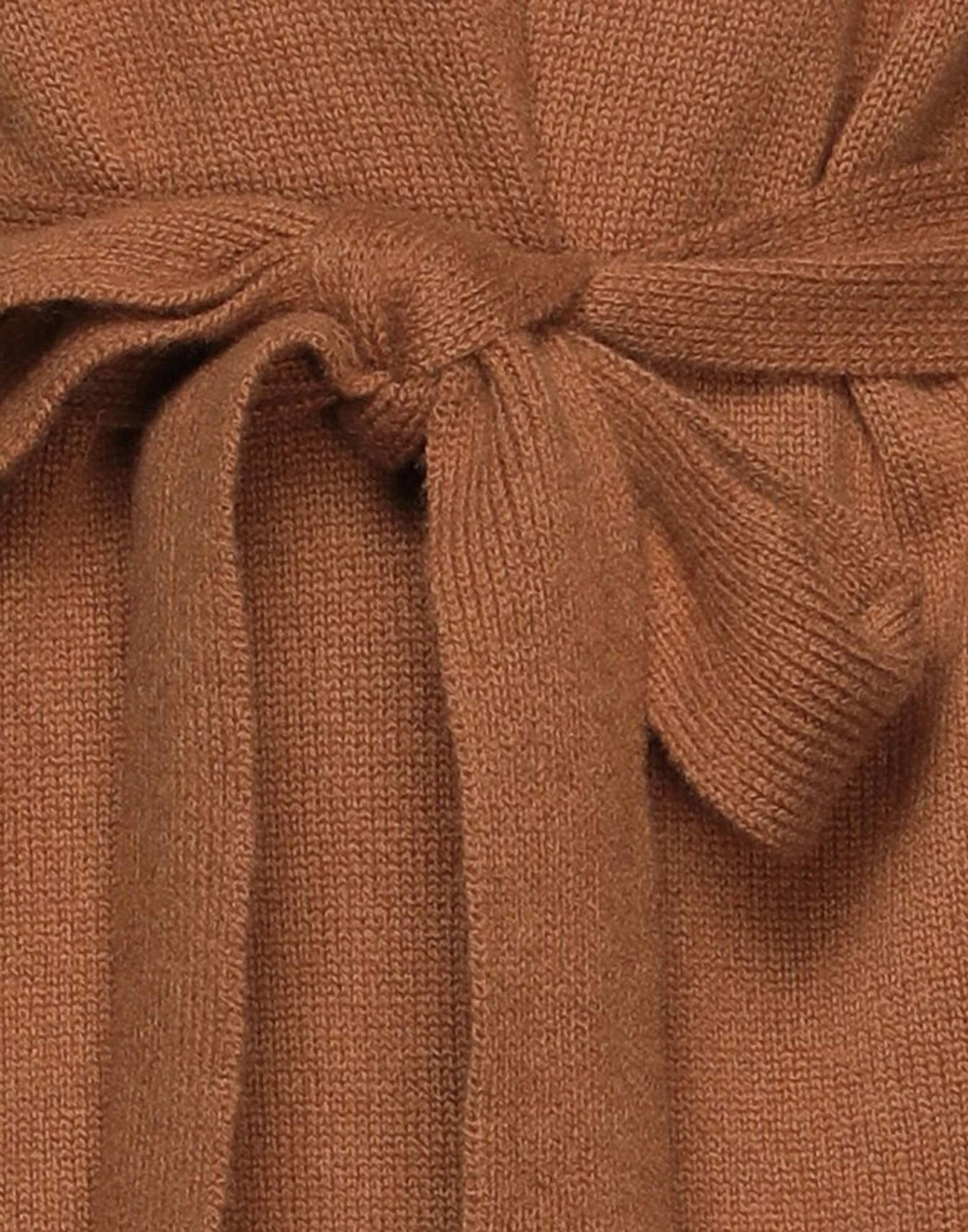 knitted, lightweight knit, belt, solid color, deep neckline, long sleeves, no pockets