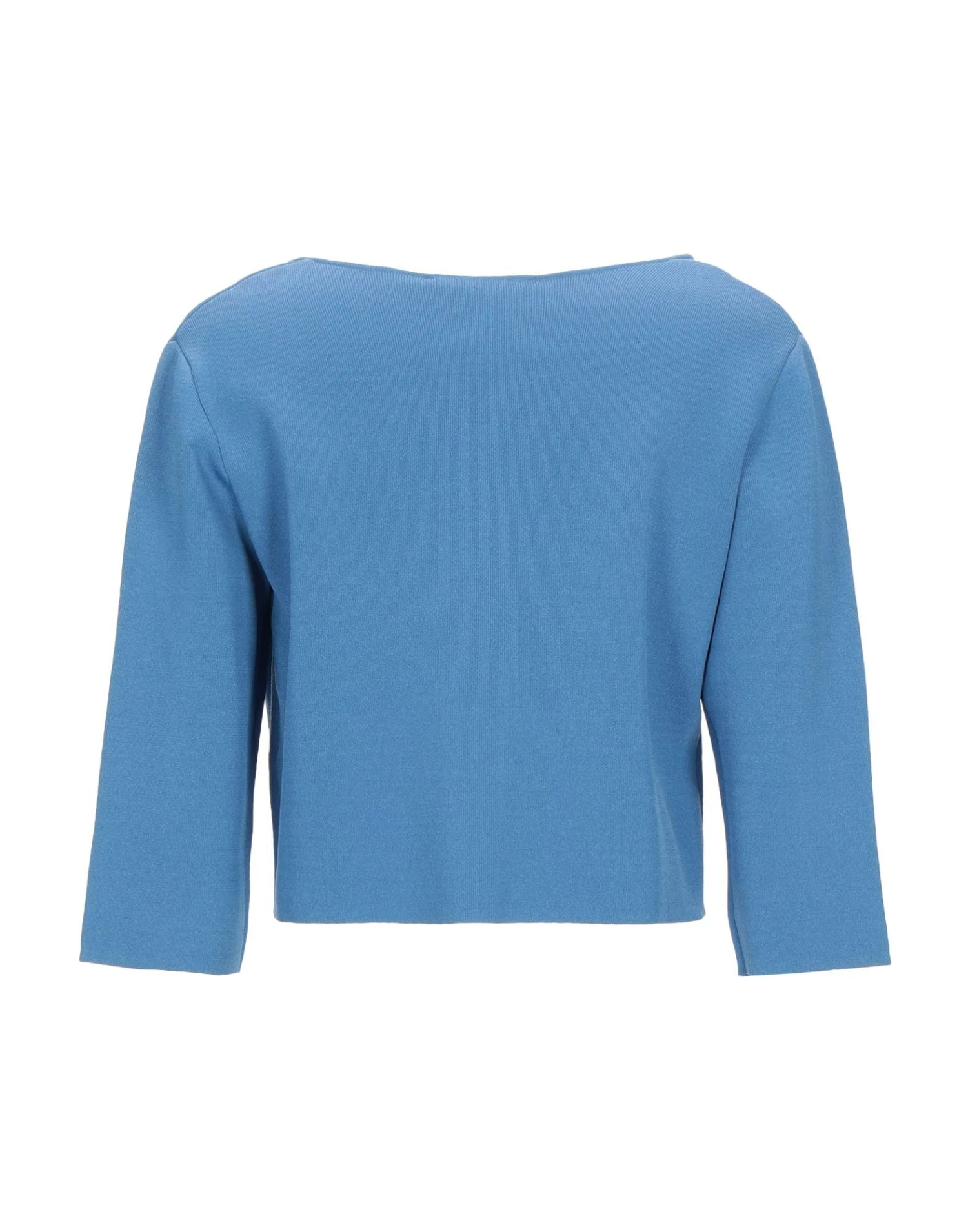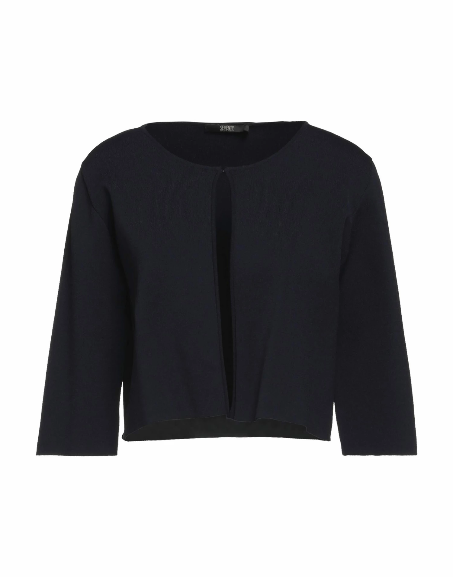 knitted, lightweight knit, no appliqués, round collar, 3/4 length sleeves, hook-and-eye closure, no pockets, solid color