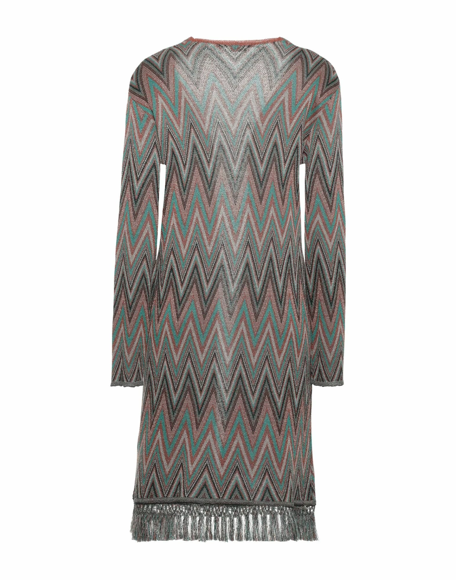 knitted, fringed, lightweight knit, deep neckline, multicolor pattern, long sleeves, no pockets