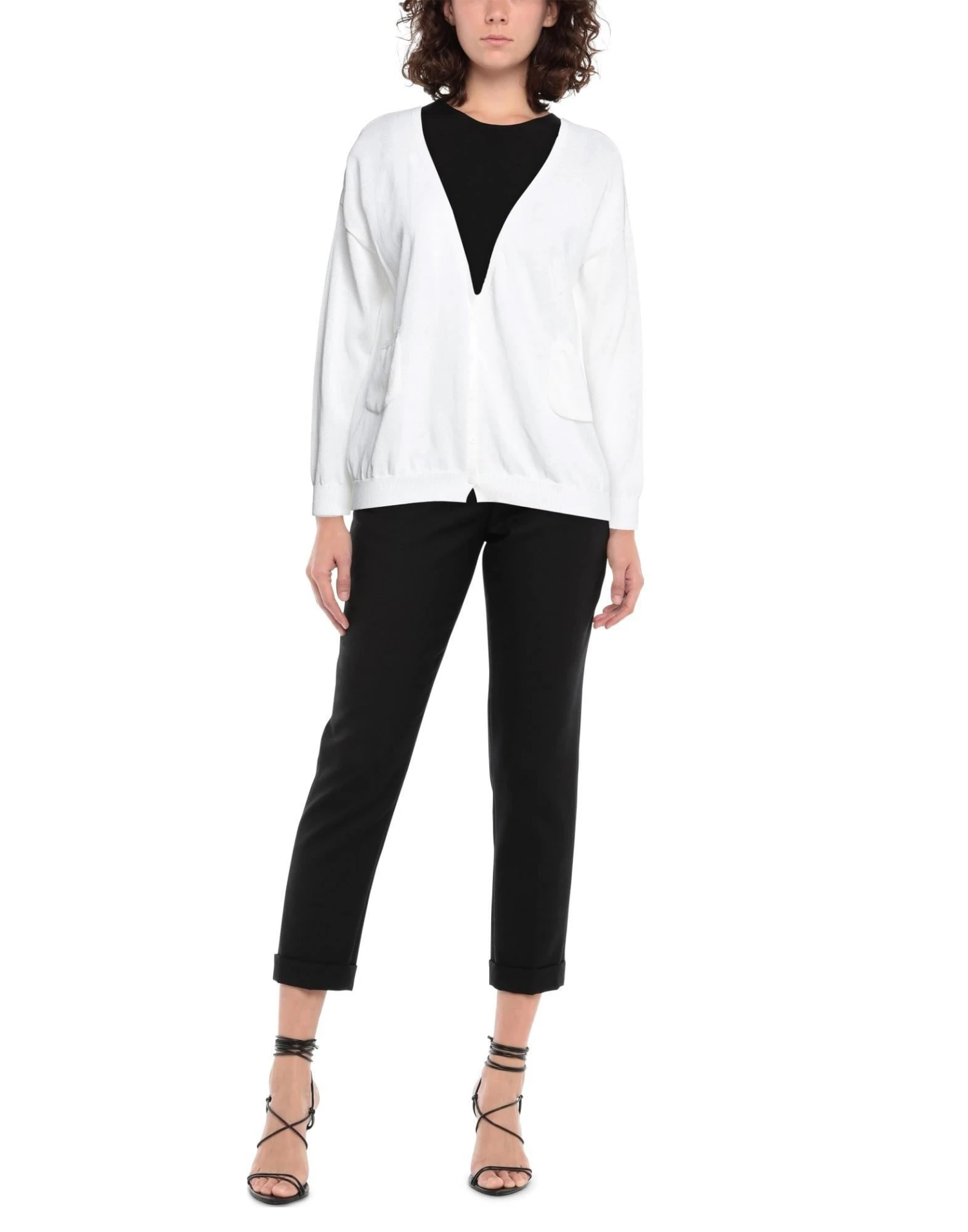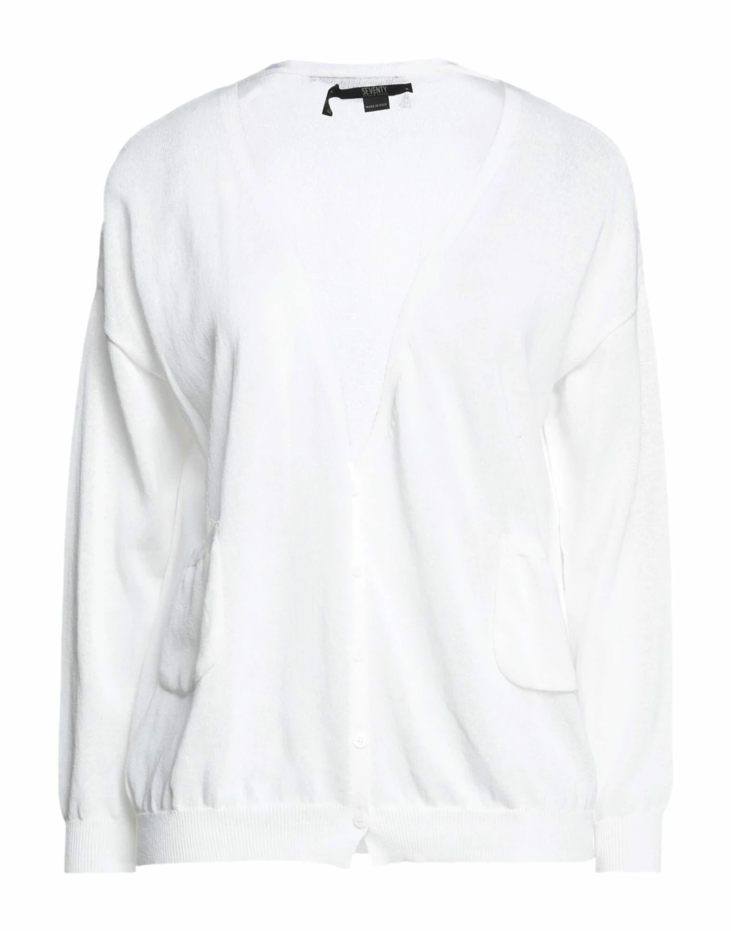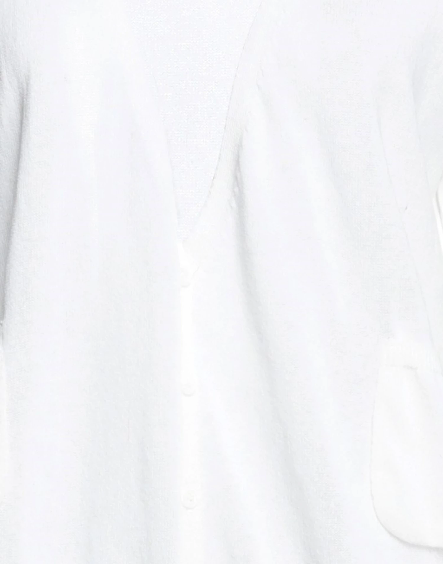 knitted, lightweight knit, no appliqués, solid color, deep neckline, long sleeves, button closing, two breast pockets