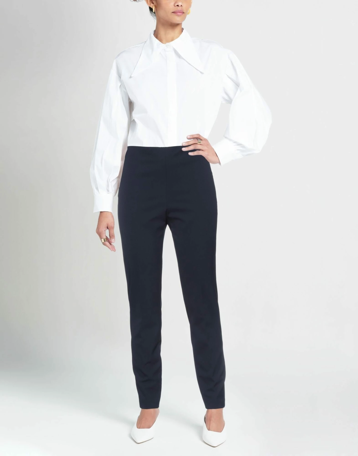 plain weave, no appliqués, high waisted, straight leg, slim-leg pants, no pockets, stretch, solid color, zipper closure