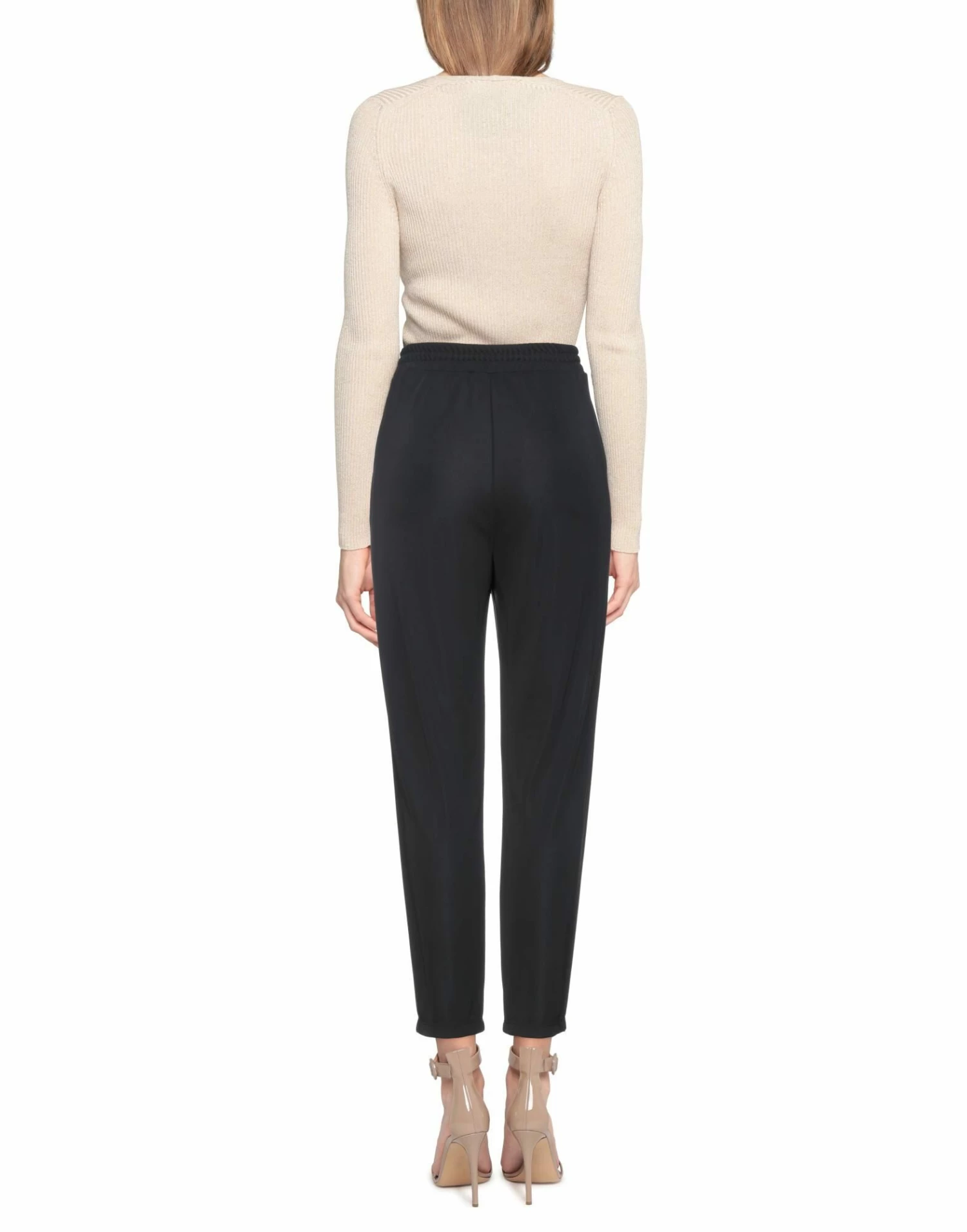 crepe, solid color, no appliqués, high waisted, comfort fit, tapered leg, elasticized waist, two pockets, stretch, unlined