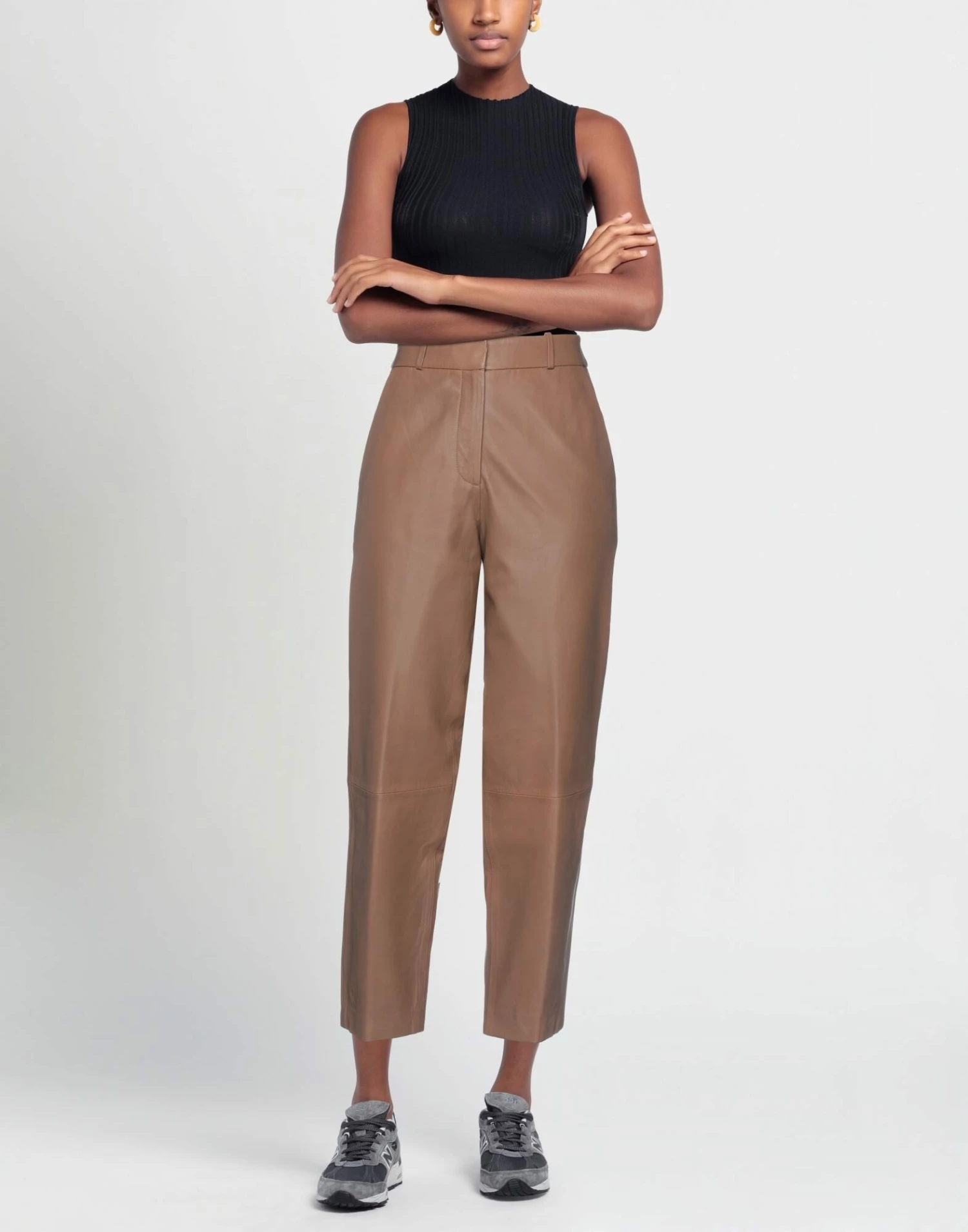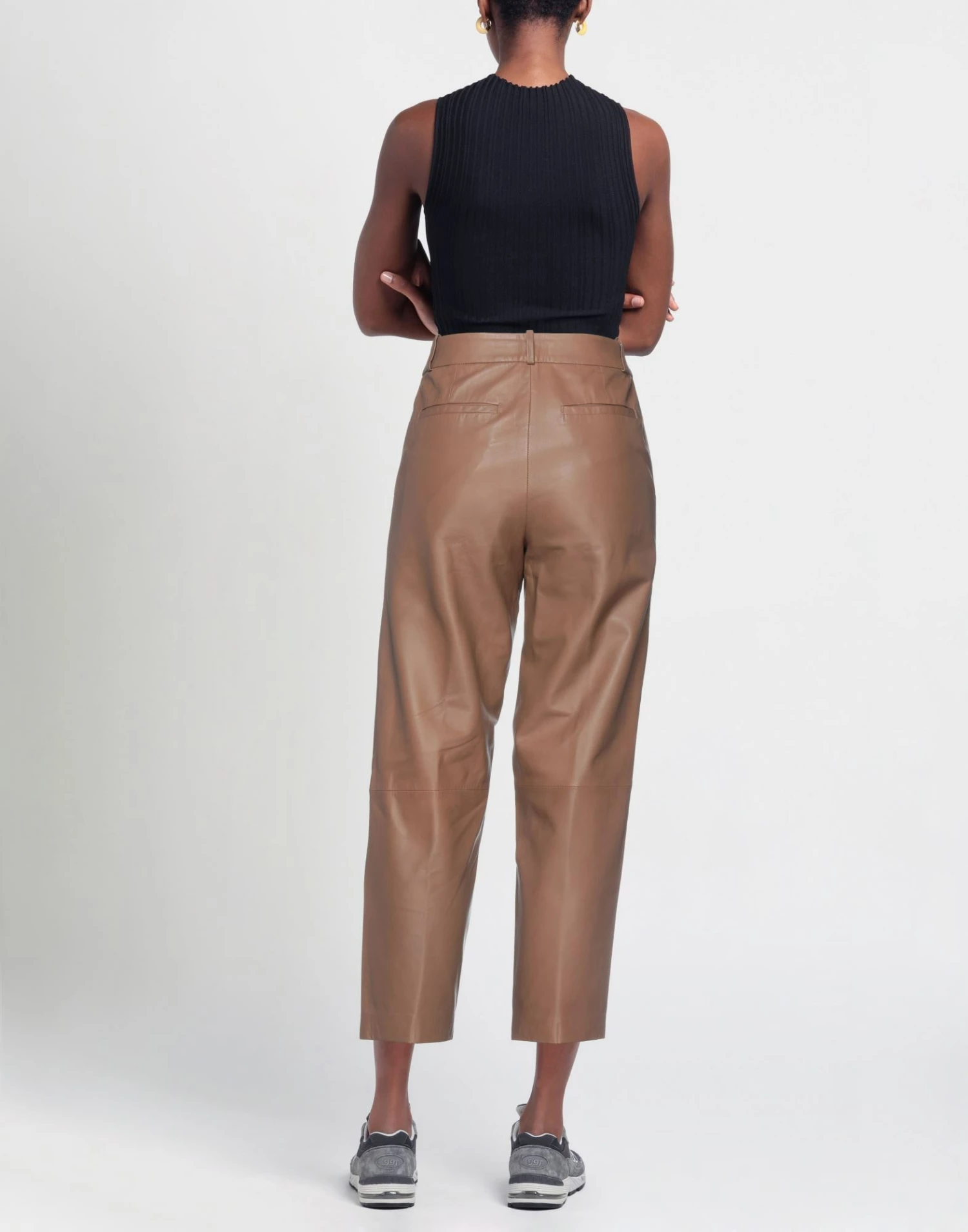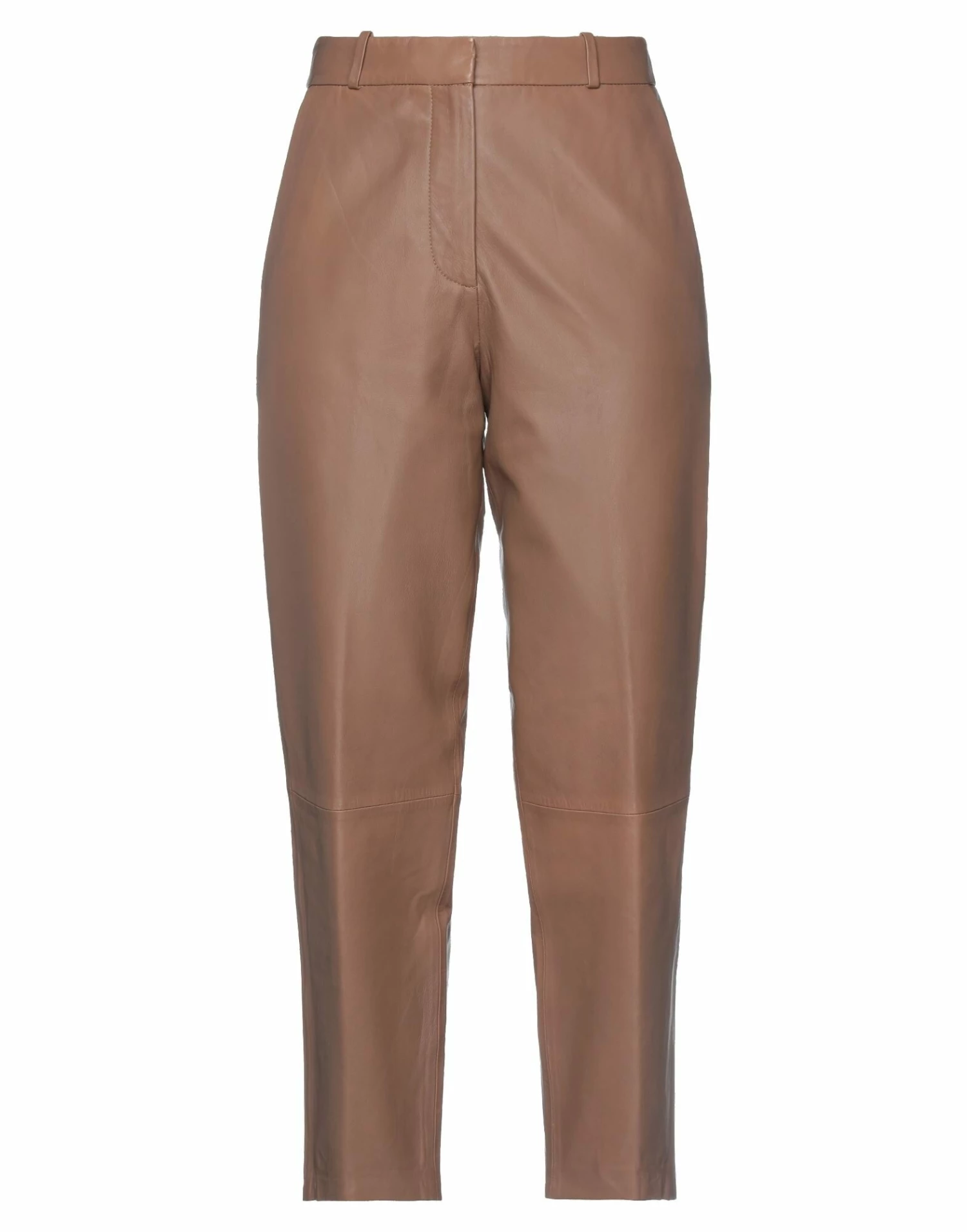 leather, no appliqués, solid color, high waisted, tapered leg, regular fit, hook-and-eye closure, zipper closure, multipockets, contains non-textile parts of animal origin