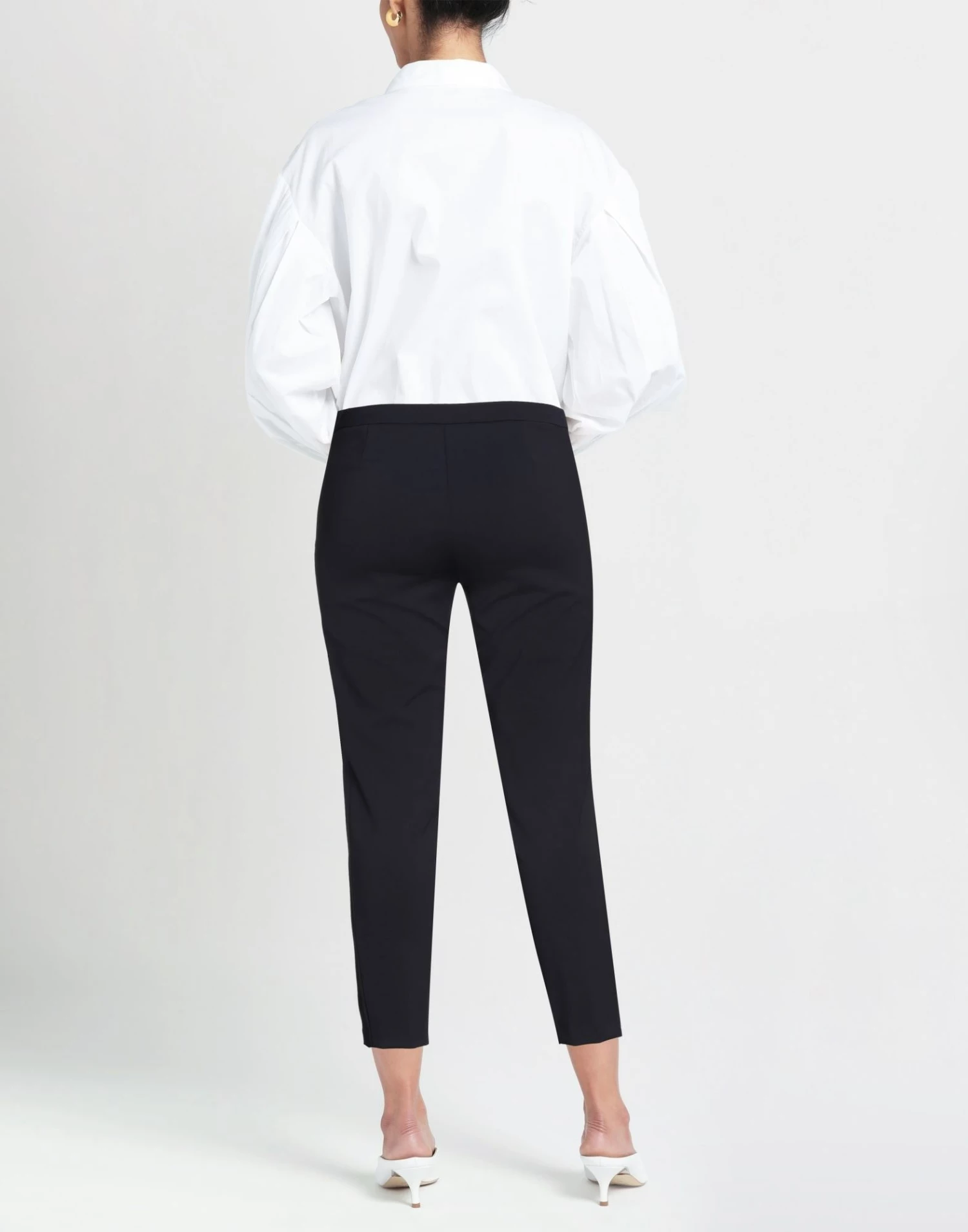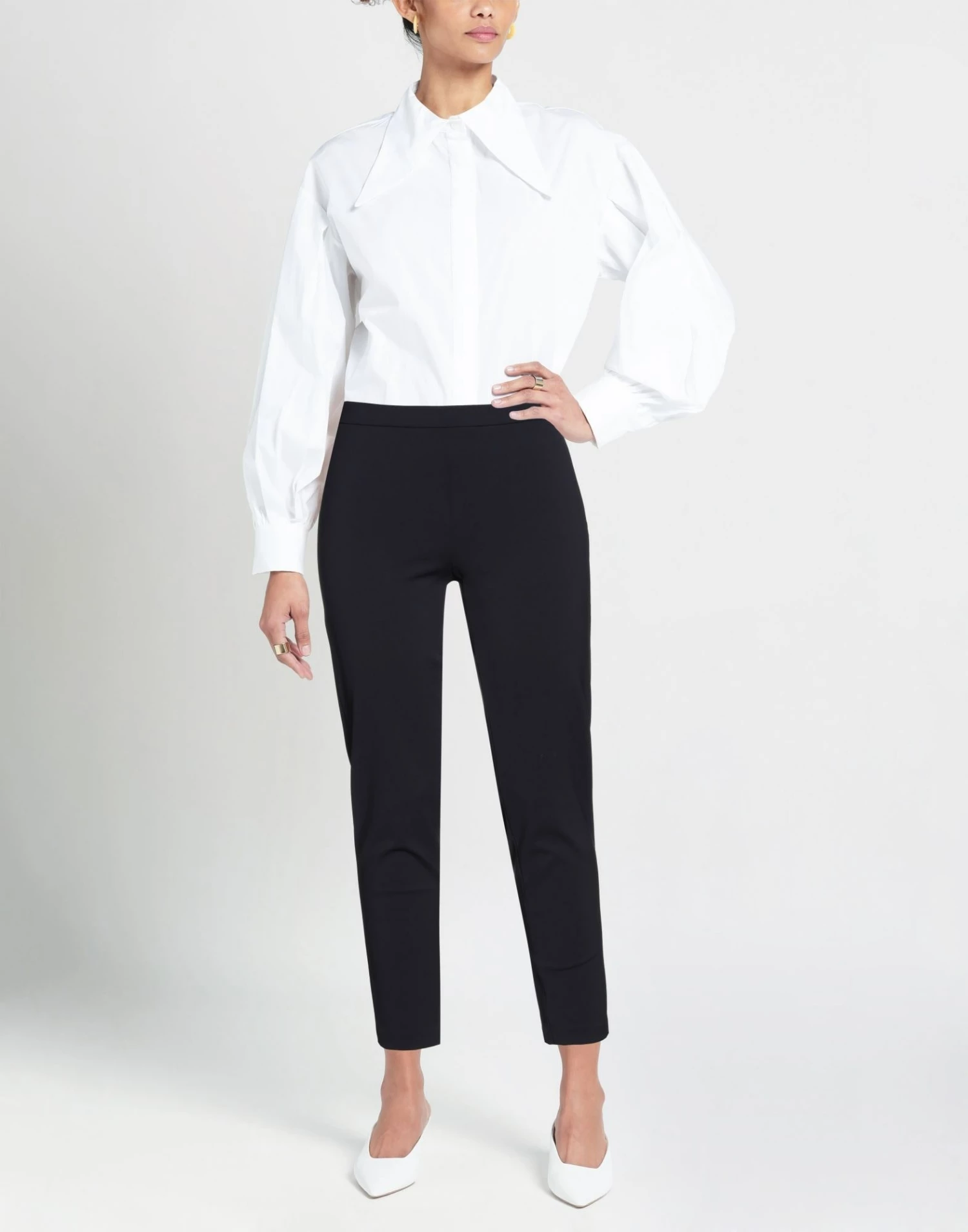 jersey, no appliqués, solid color, mid rise, tapered leg, regular fit, hook-and-eye closure, zipper closure, no pockets, stretch