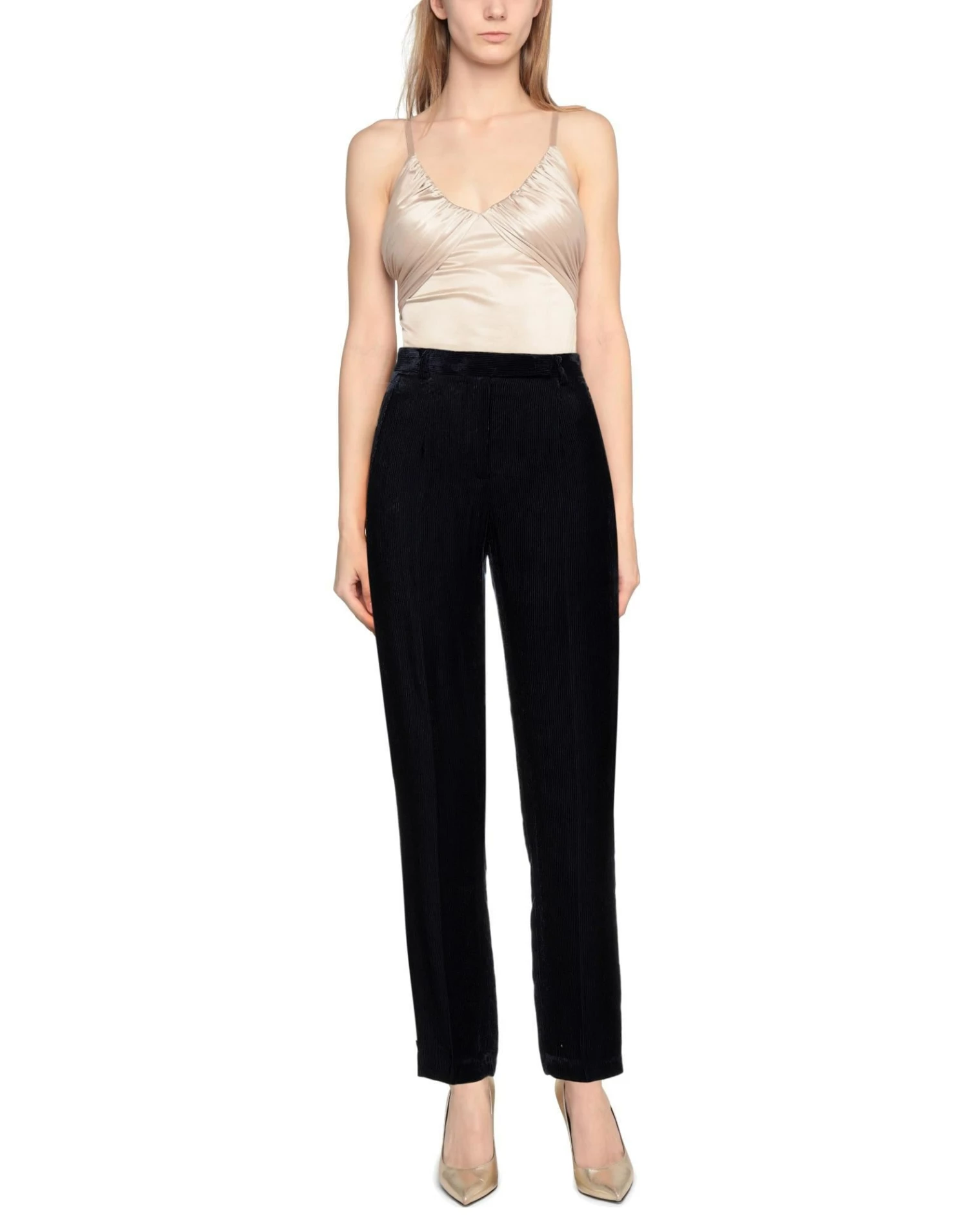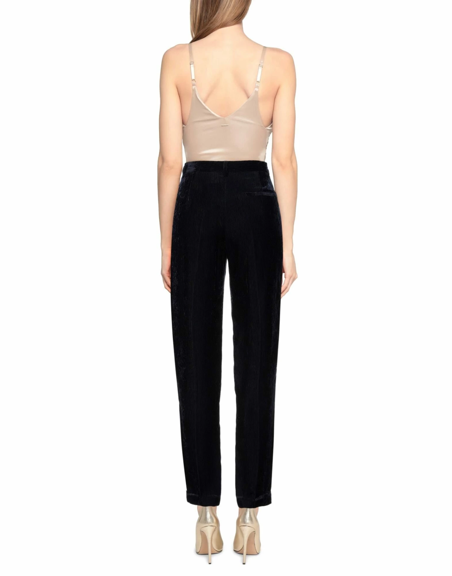 velvet, ribbed, solid color, no appliqués, high waisted, regular fit, tapered leg, hook-and-bar, zip, multipockets