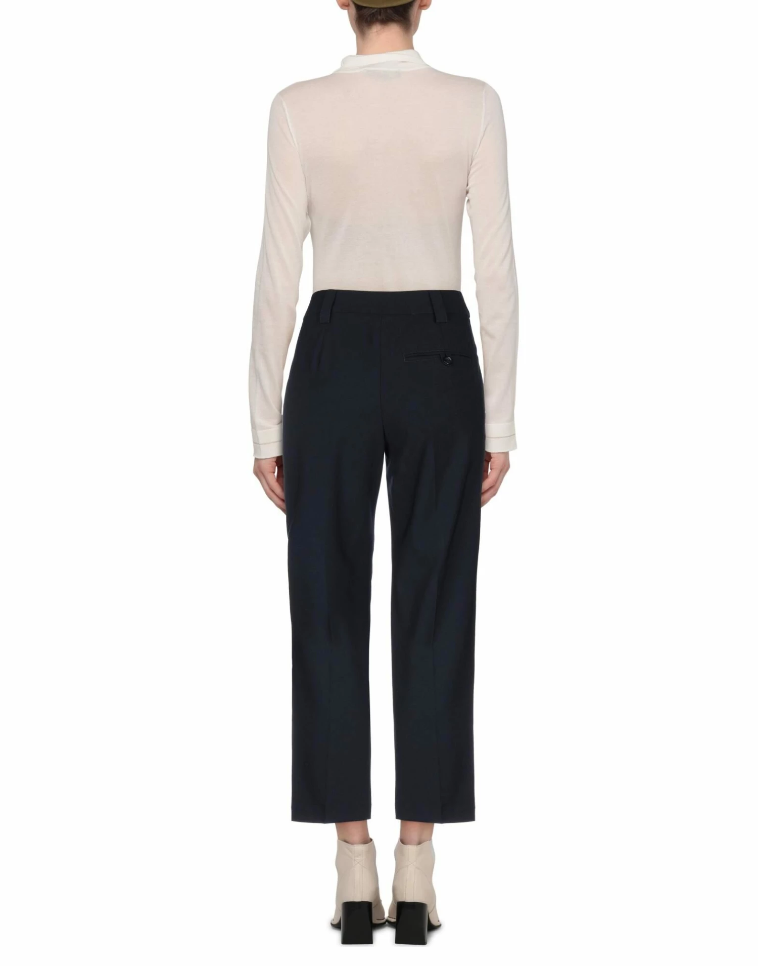 cool wool, darts, basic solid color, mid rise, regular fit, tapered leg, hook-and-bar, zip, multipockets, stretch