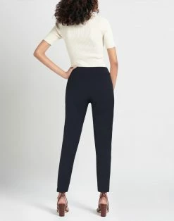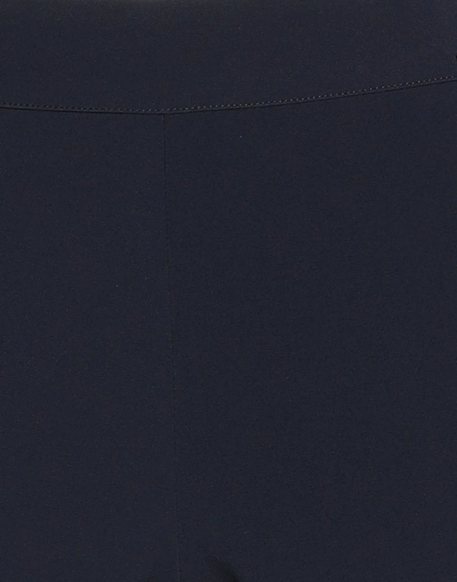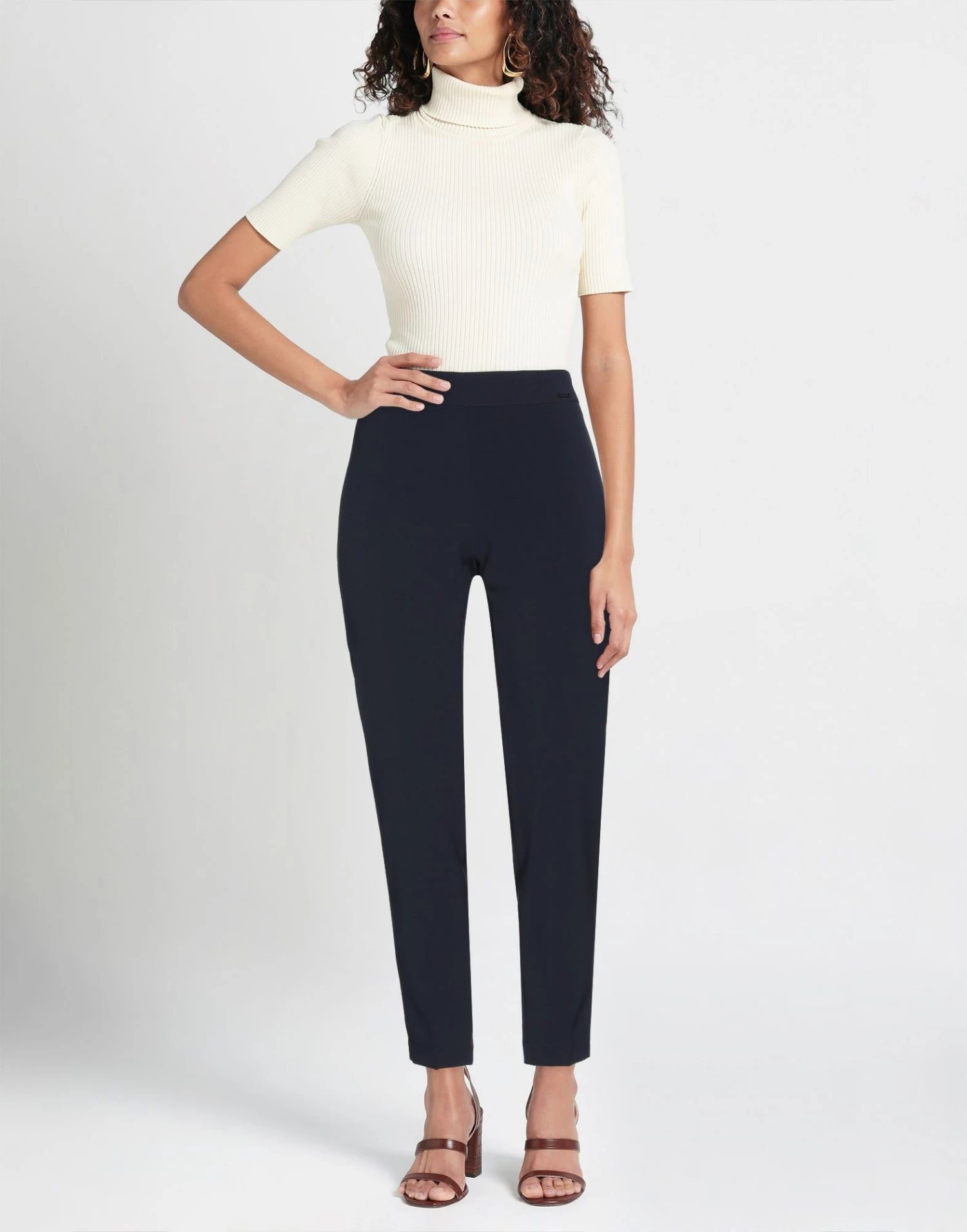 crepe, brand logo, solid color, high waisted, tapered leg, regular fit, zipper closure, no pockets, stretch, tailored