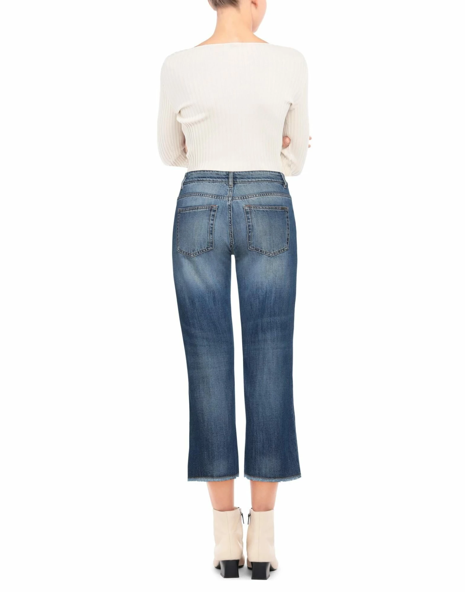 denim, logo, medium wash, mid rise, front closure, button, zip, multipockets, raw-cut hem, solid color
