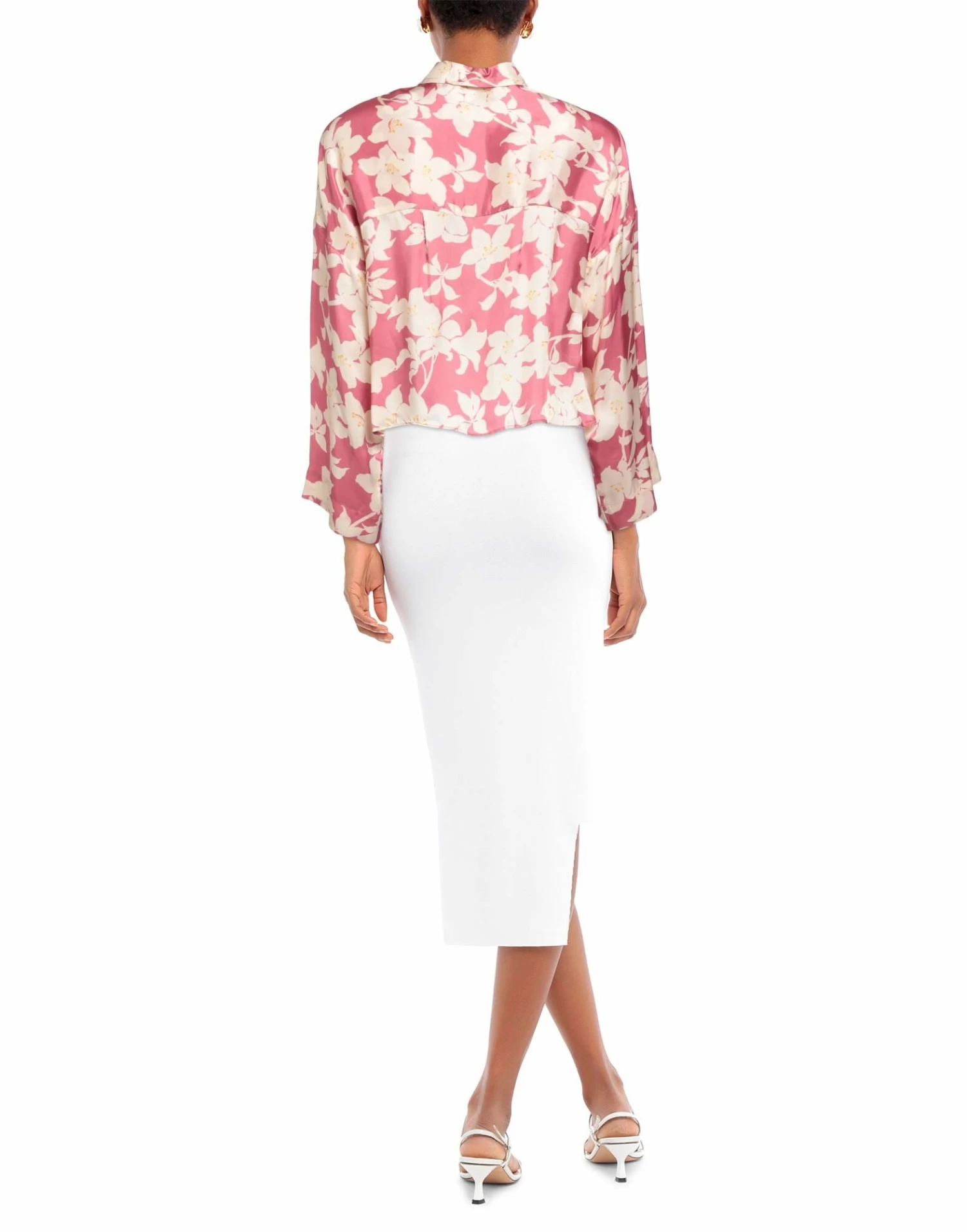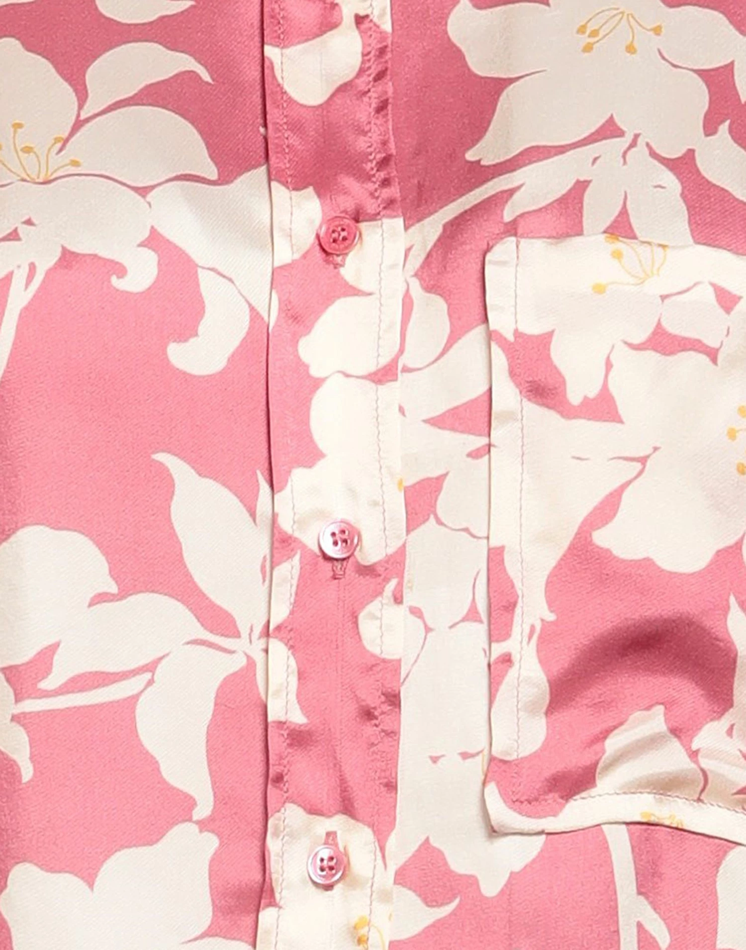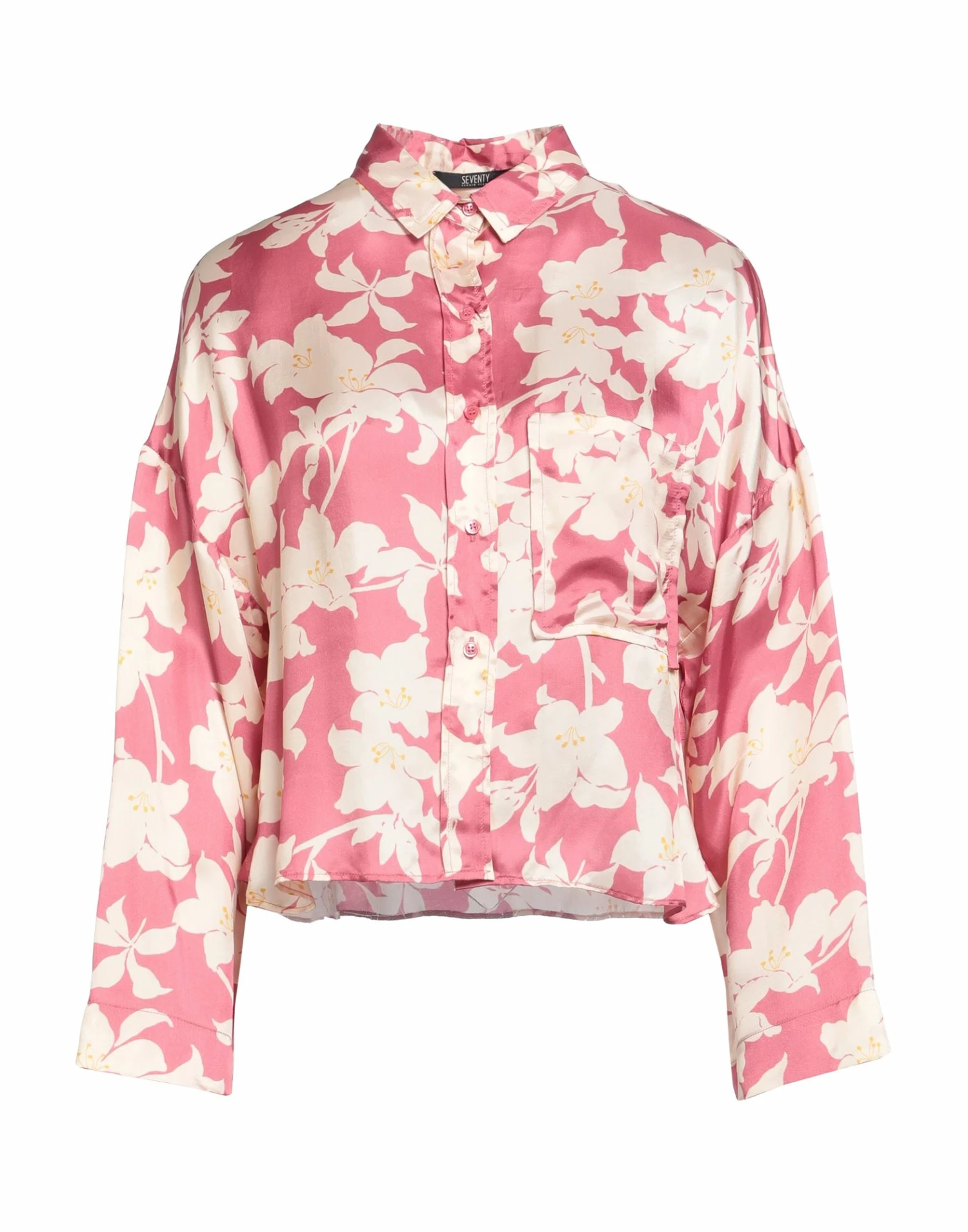 satin, no appliqués, floral design, classic neckline, long sleeves, button closing, single pocket