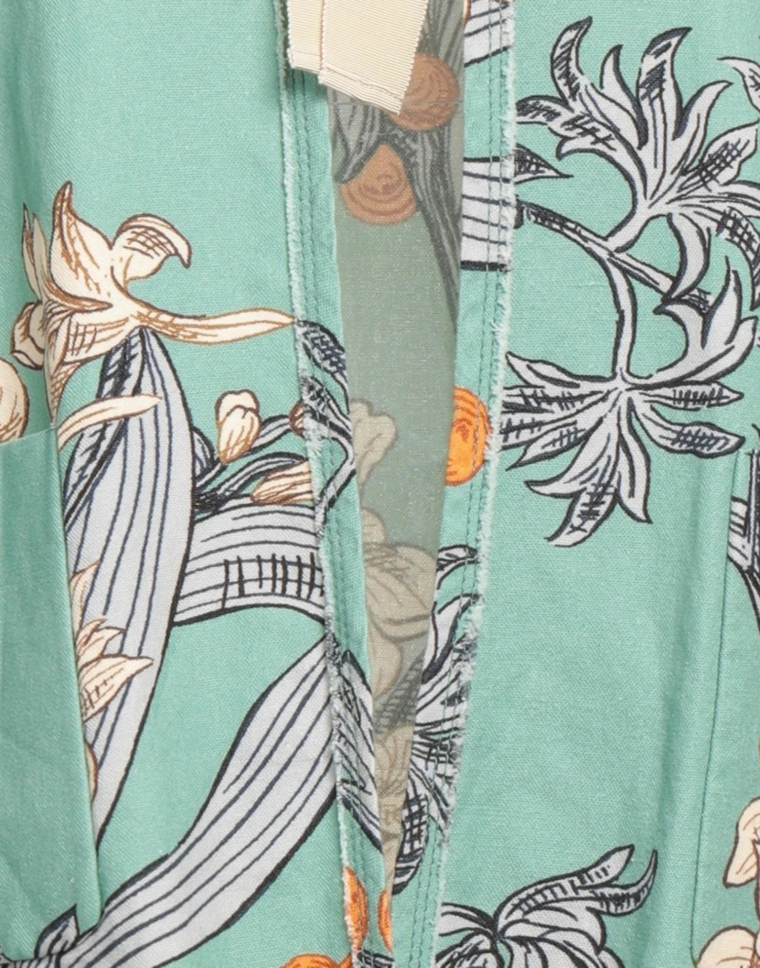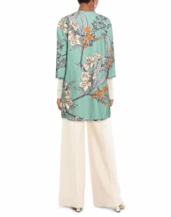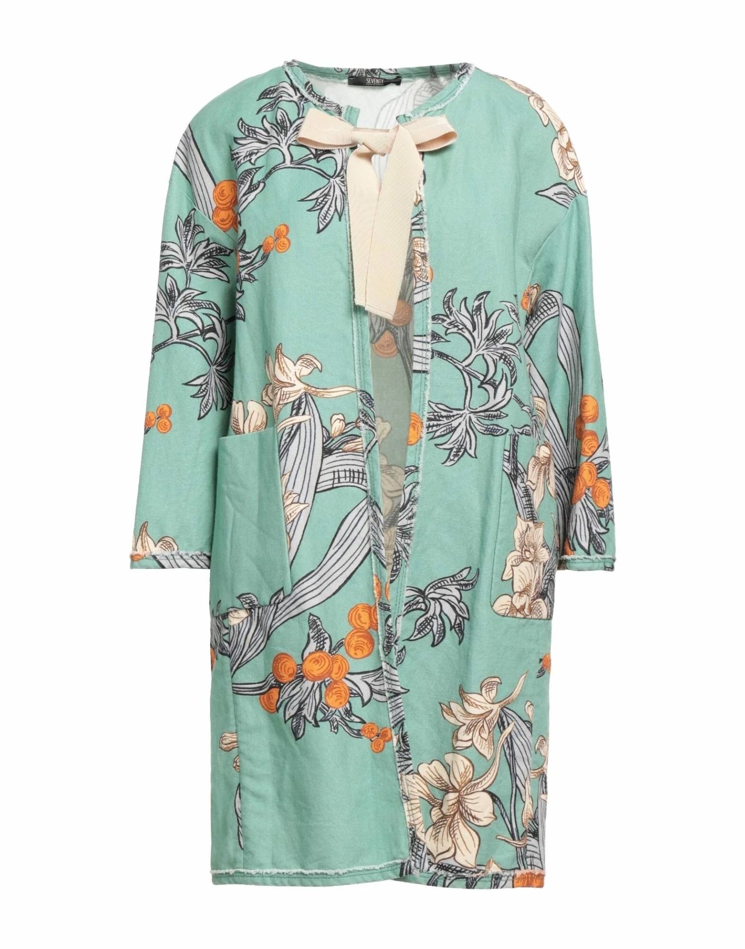 plain weave, no appliqués, floral design, round collar, single-breasted , long sleeves, unlined, self-tie closure, multipockets