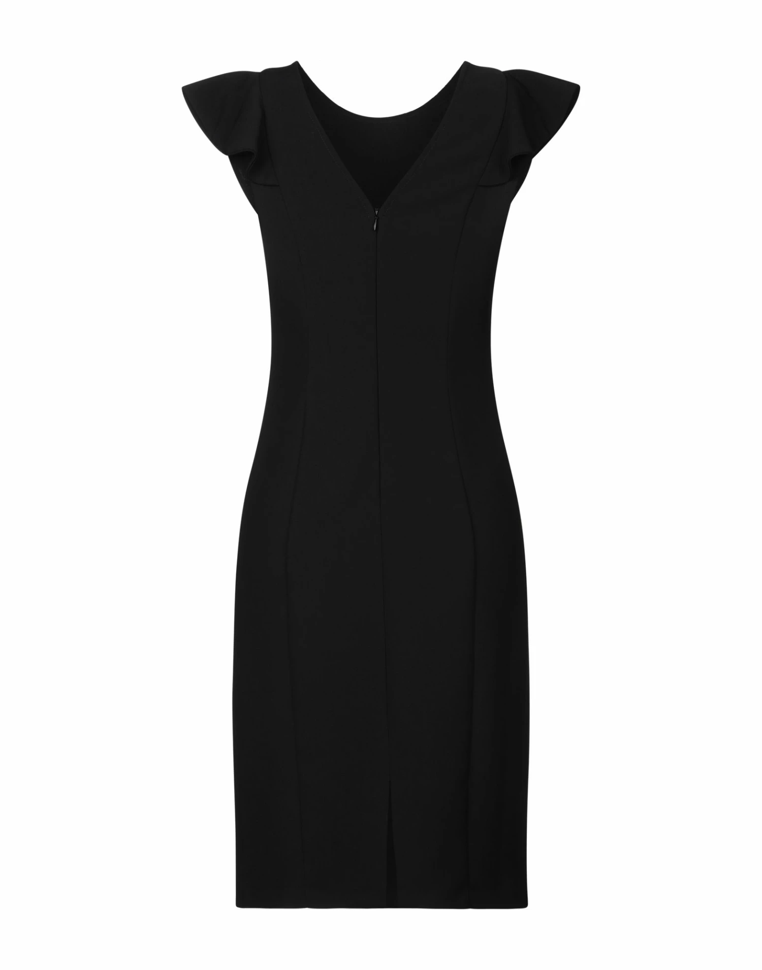 crepe, ruffles, basic solid color, wide neckline, short sleeves, no pockets, rear closure, zip, unlined, stretch, pencil style