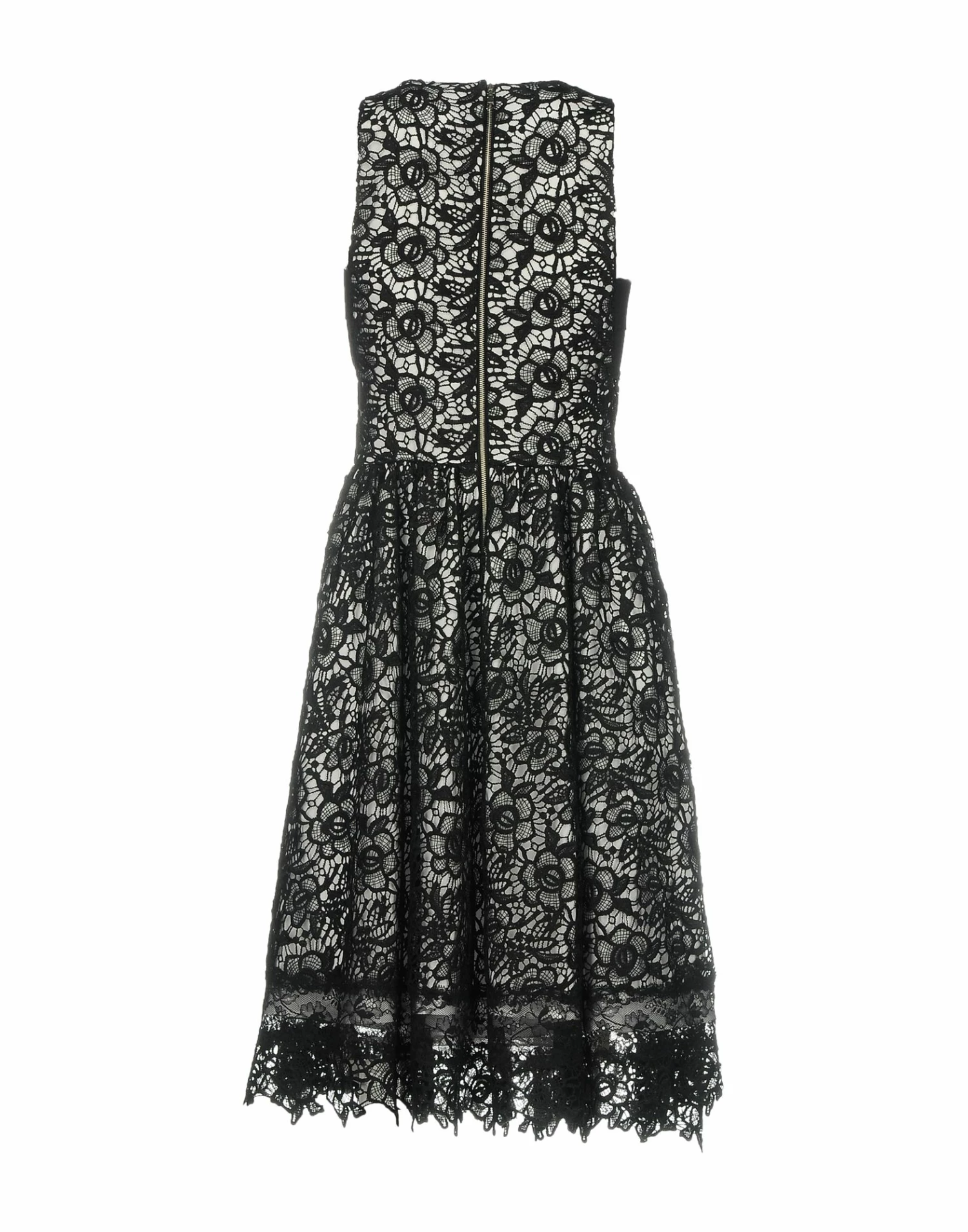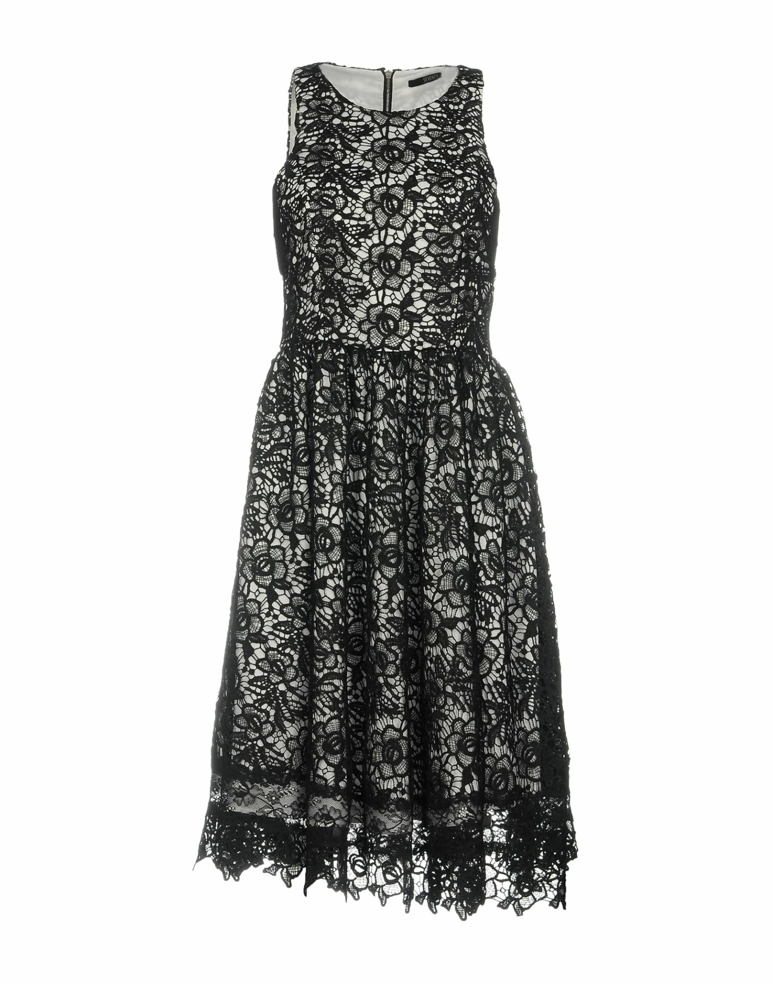 lace, no appliqués, two-tone, round collar, sleeveless, no pockets, fully lined, rear closure, zip, flared style