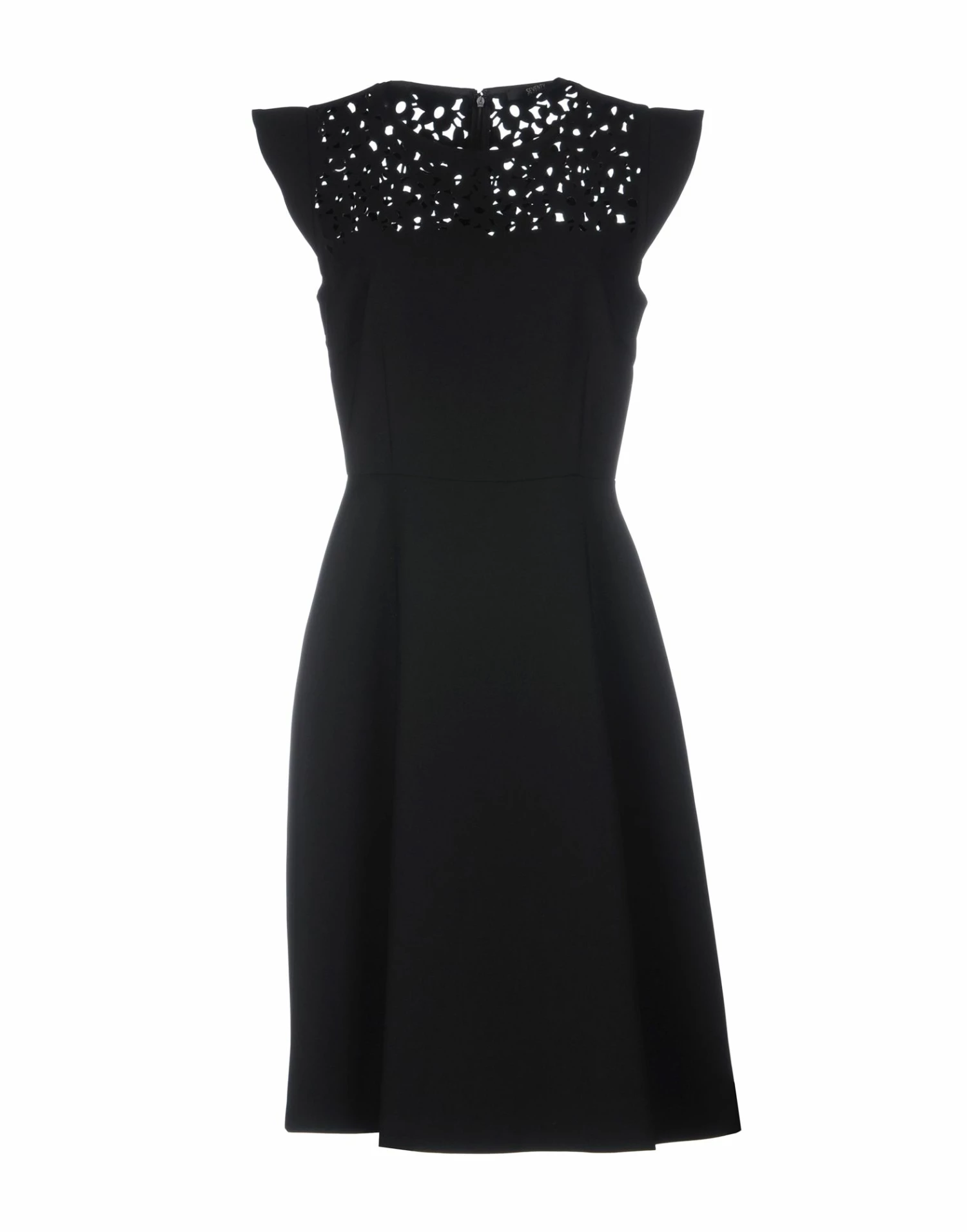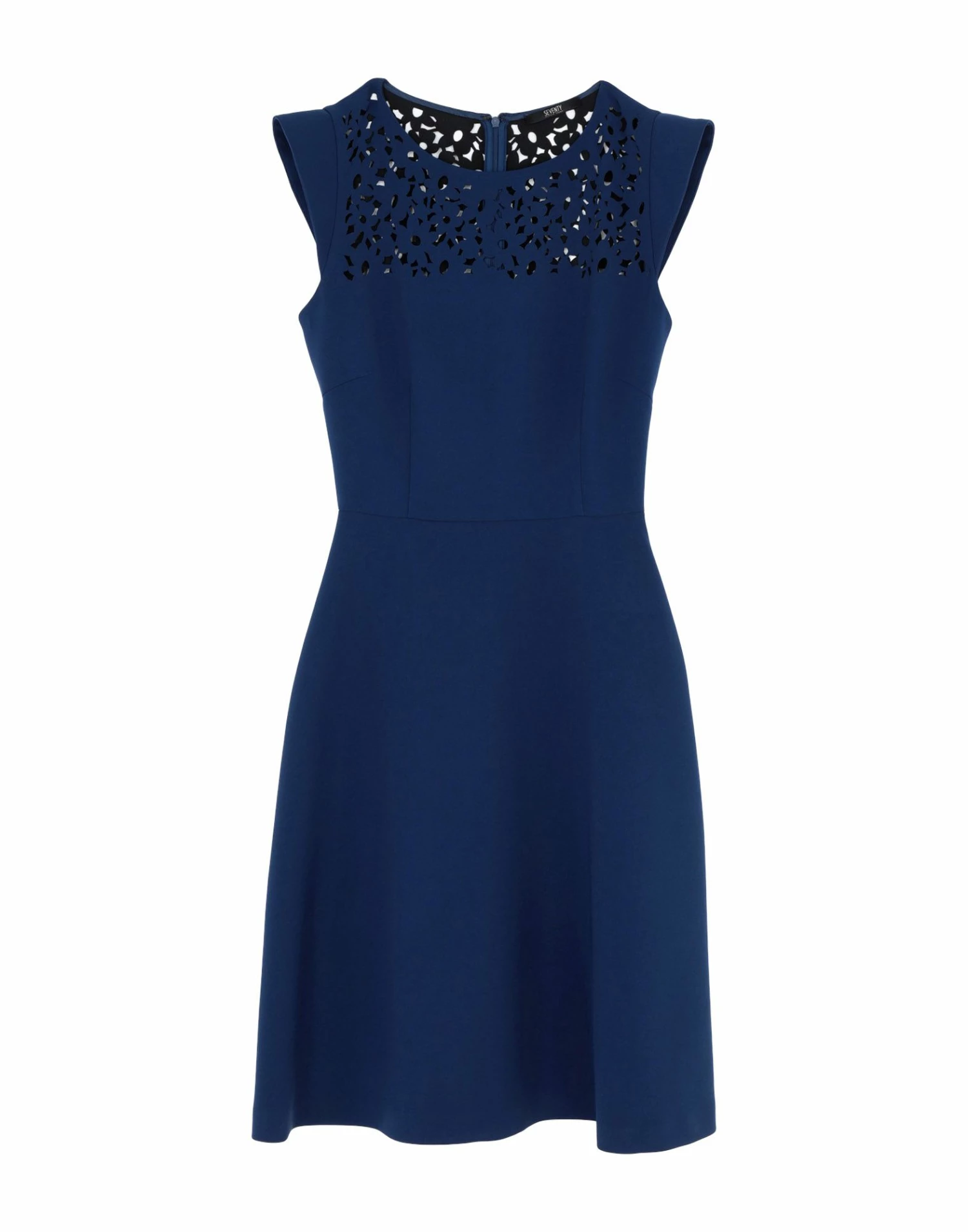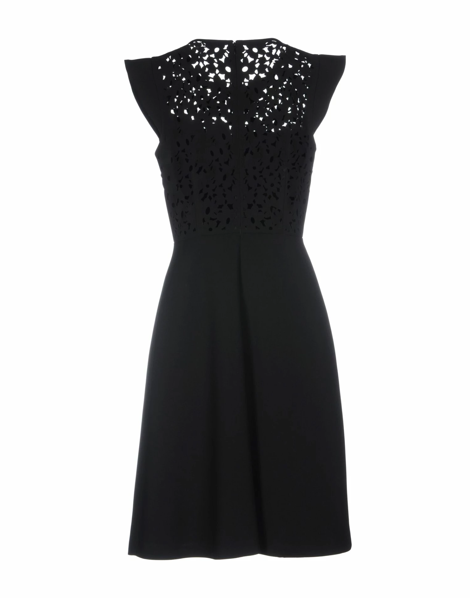 crepe, no appliqués, basic solid color, round collar, short sleeves, no pockets, unlined, rear closure, zip, stretch, trapeze style