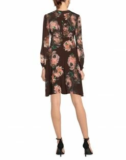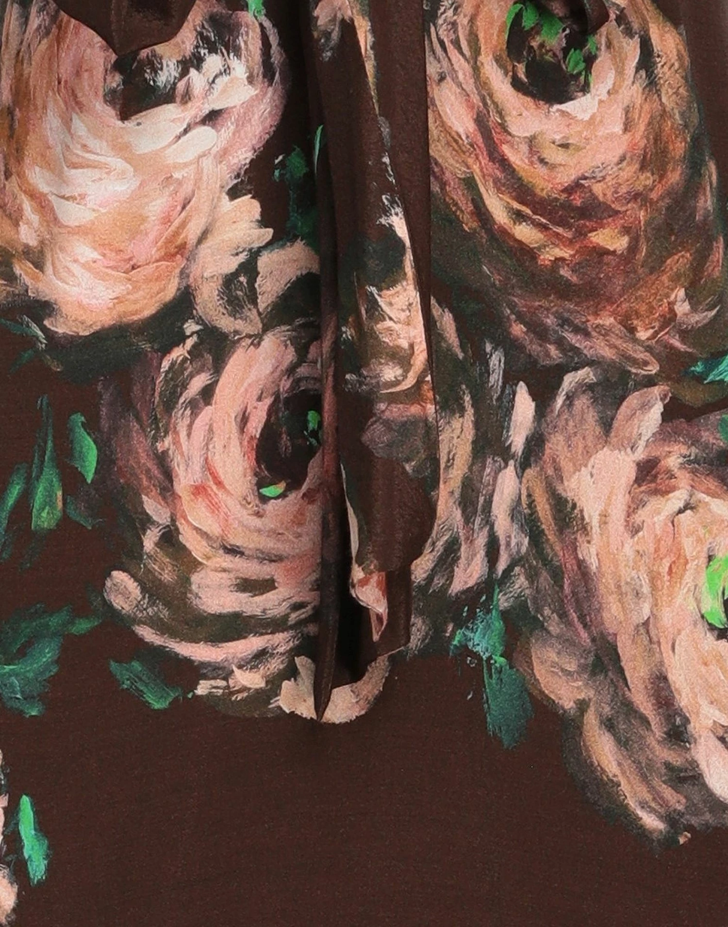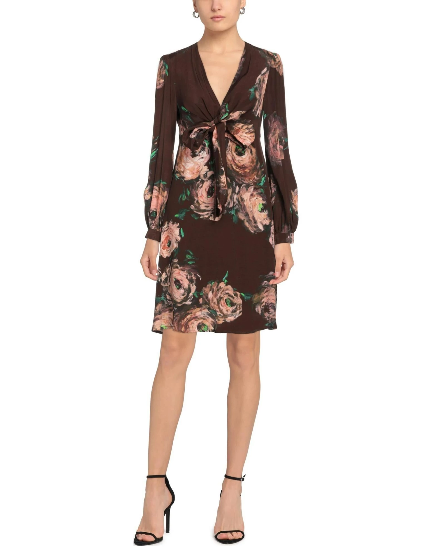 crepe, belt, detachable application, floral design, long sleeves, buttoned cuffs, zipper closure, no pockets, v-neck, contains non-textile parts of animal origin, partially lined interior, flared style