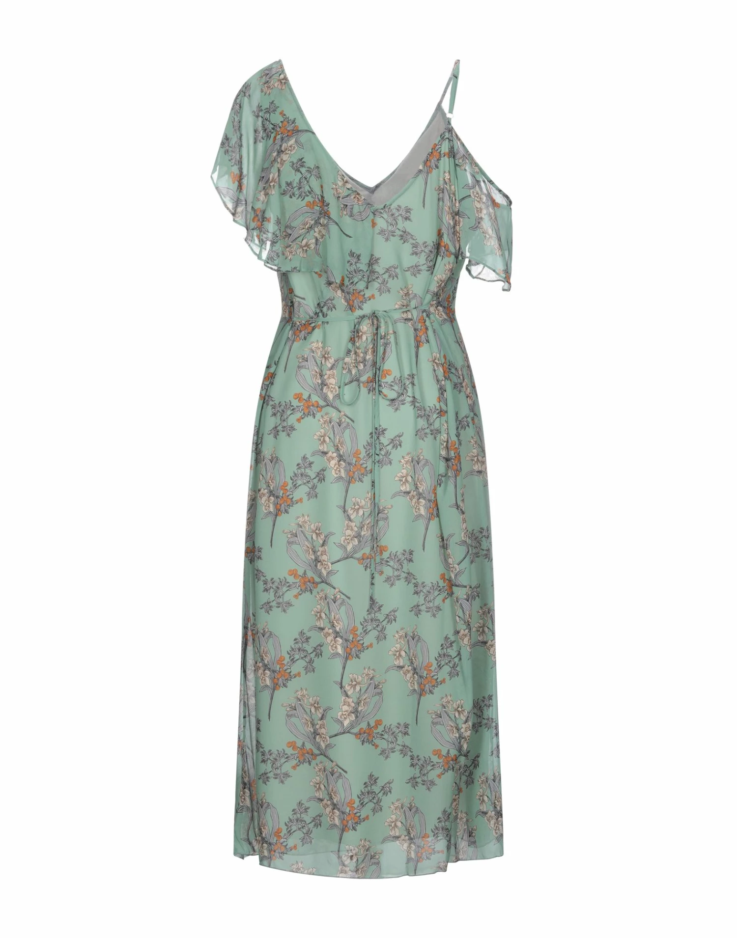 crepe, ruffles, floral design, v-neck, short sleeves, no pockets, no fastening, fully lined
