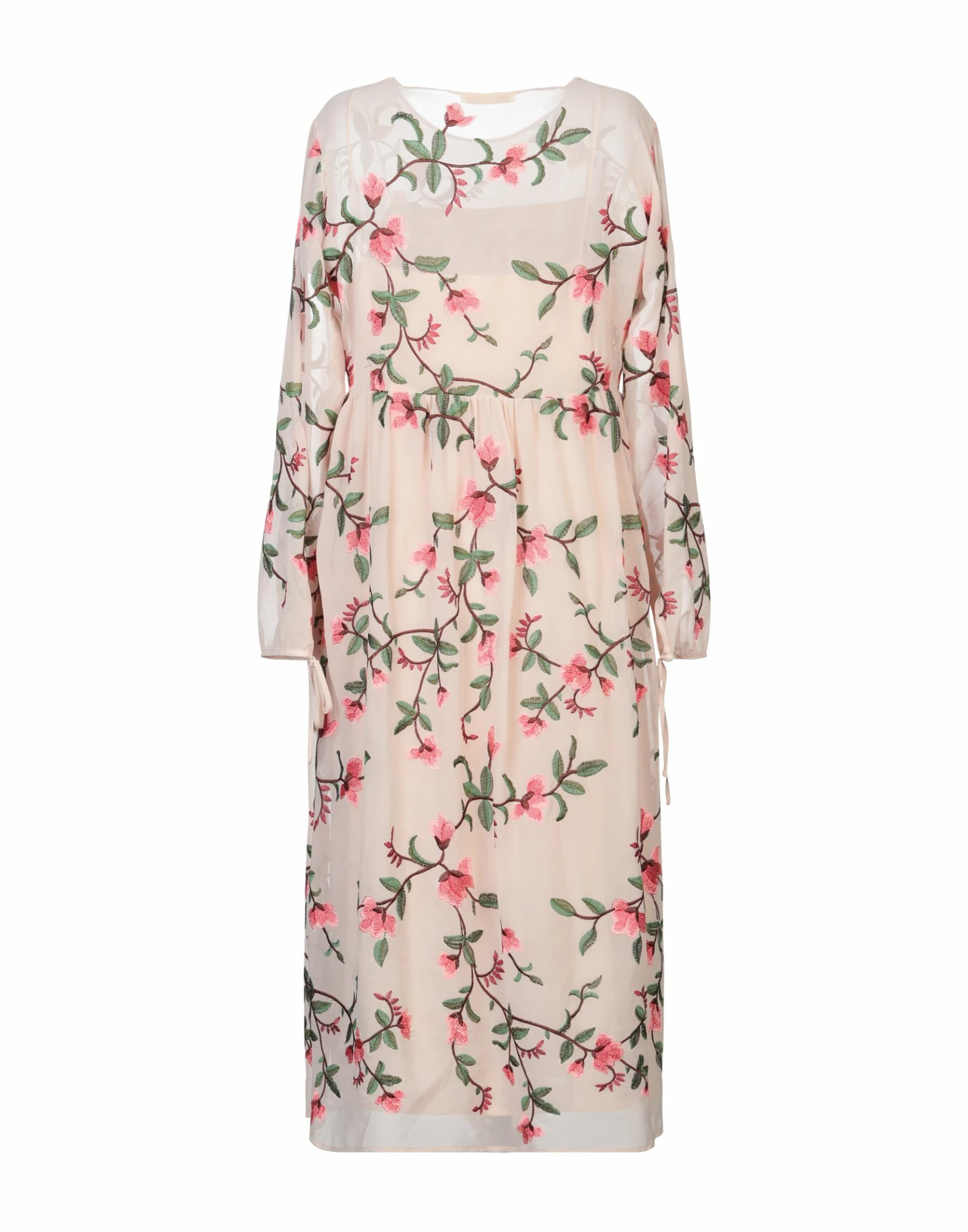 crepe, no appliqués, floral design, round collar, long sleeves, no pockets, side closure, zip, slip to line, trapeze style
