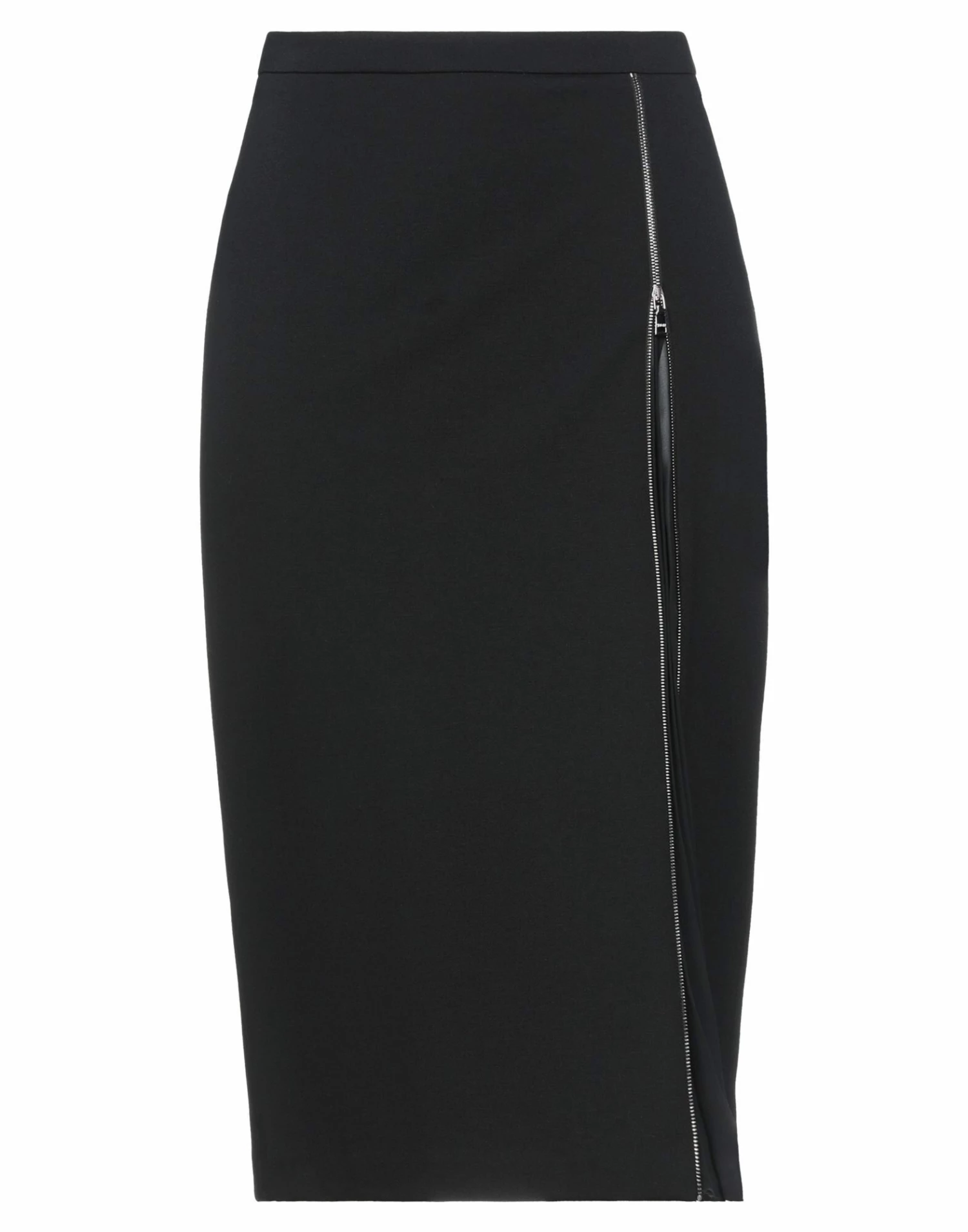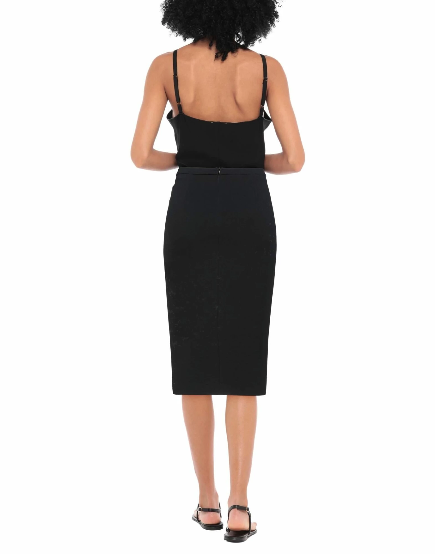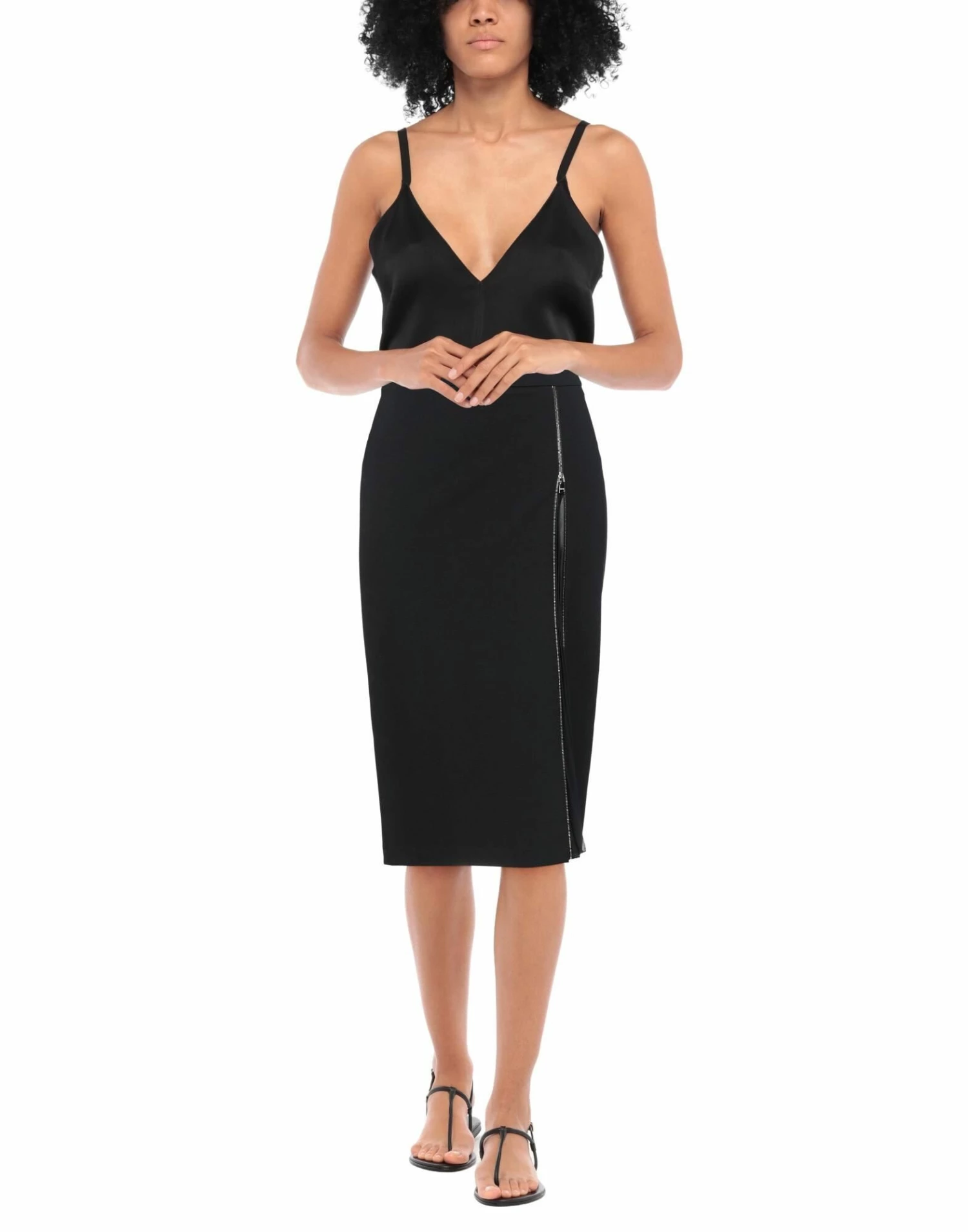 crepe, jersey, pleated, metal applications, brand logo, solid color, no pockets, rear closure, zipper closure, unlined, stretch