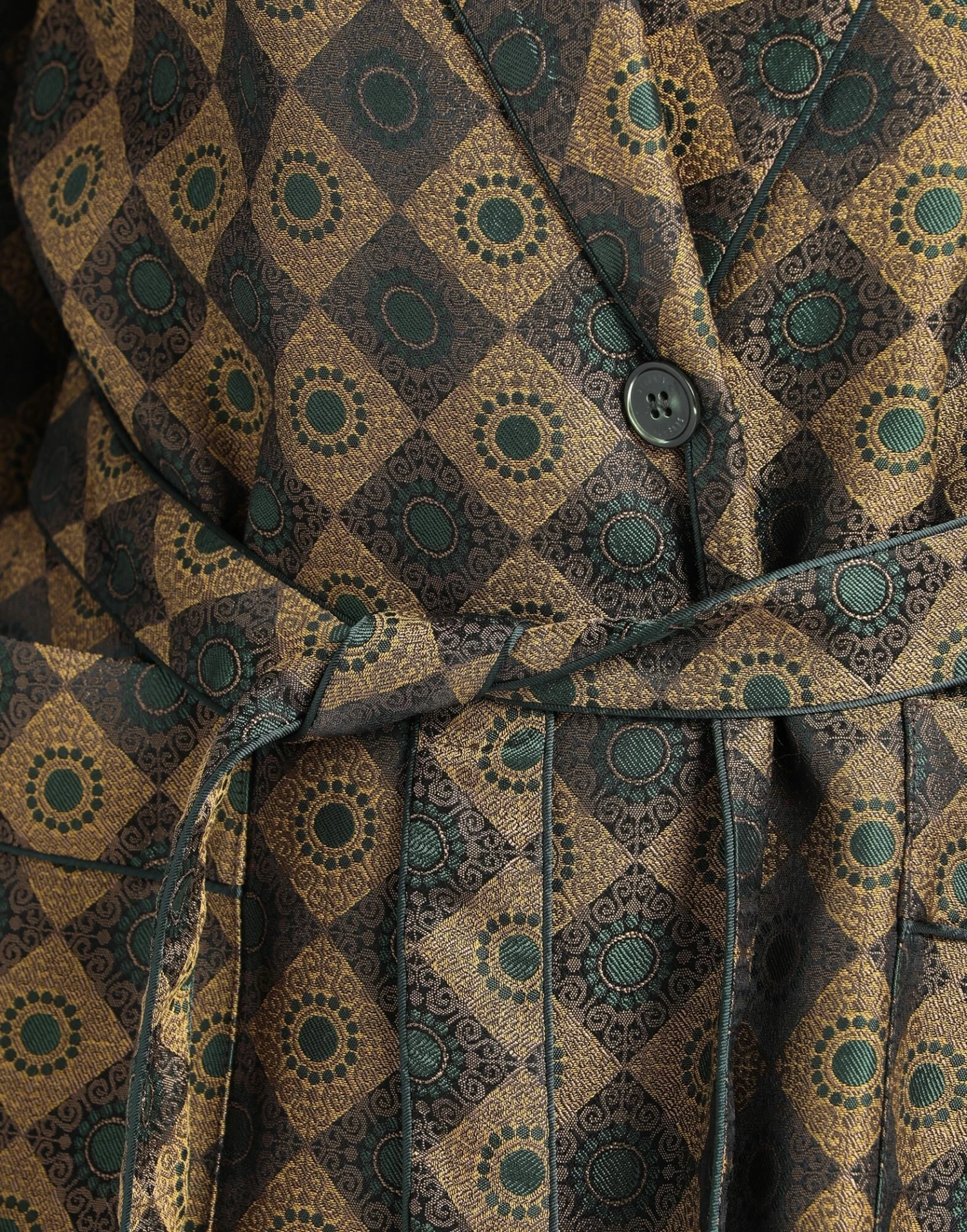 jacquard, plain weave, sash, geometric design, lapel collar, single-breasted , long sleeves, fully lined, 1 button, multipockets