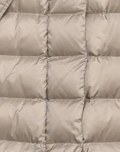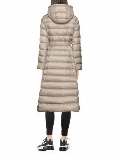 techno fabric, quilted, belt, brand logo, solid color, hooded collar, single-breasted , long sleeves, duck down filling, zipper closure, snap buttons fastening, multipockets, contains non-textile parts of animal origin, single-breasted jacket