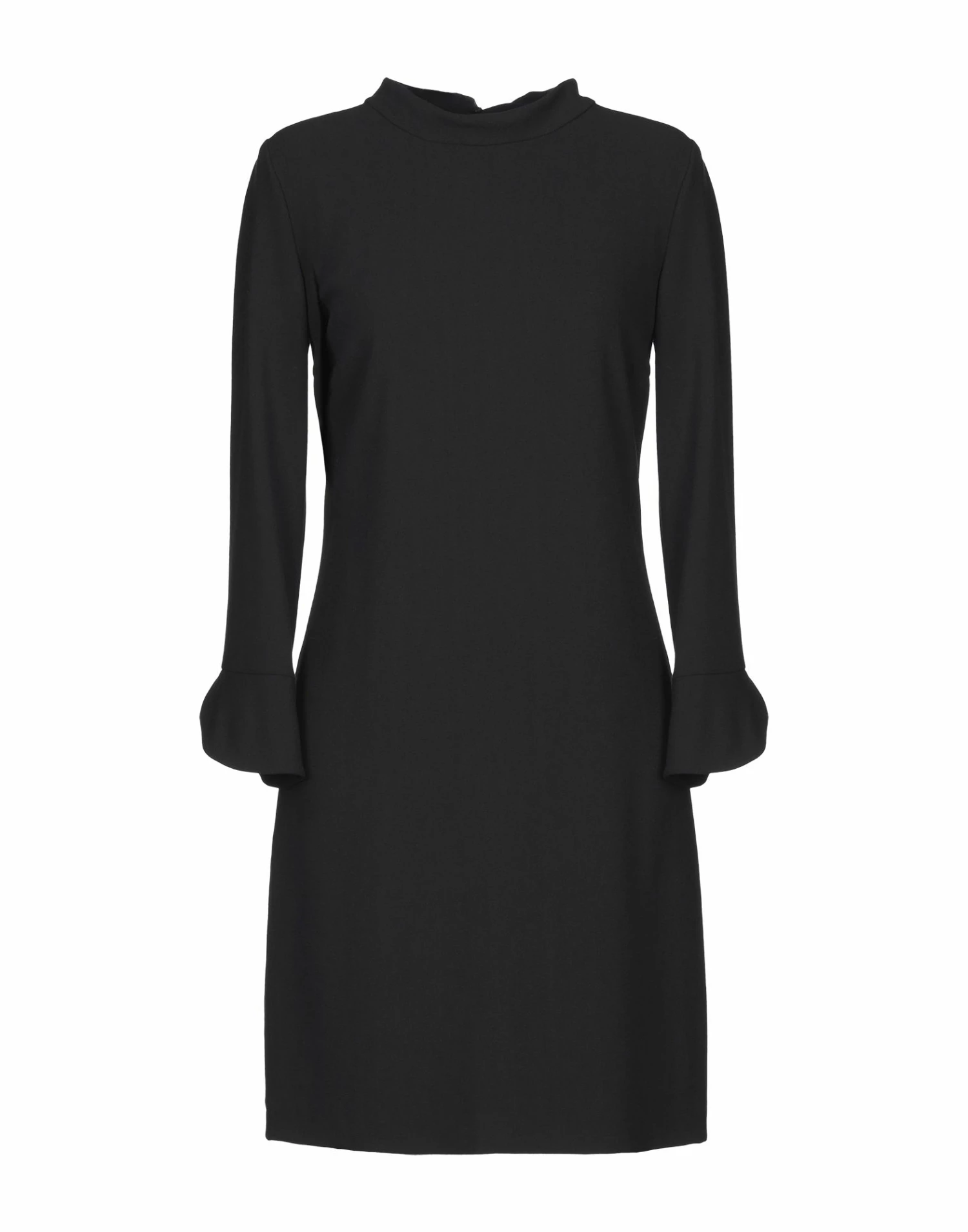 crepe, no appliqués, basic solid color, round collar, long sleeves, no pockets, rear closure, zip, fully lined, stretch