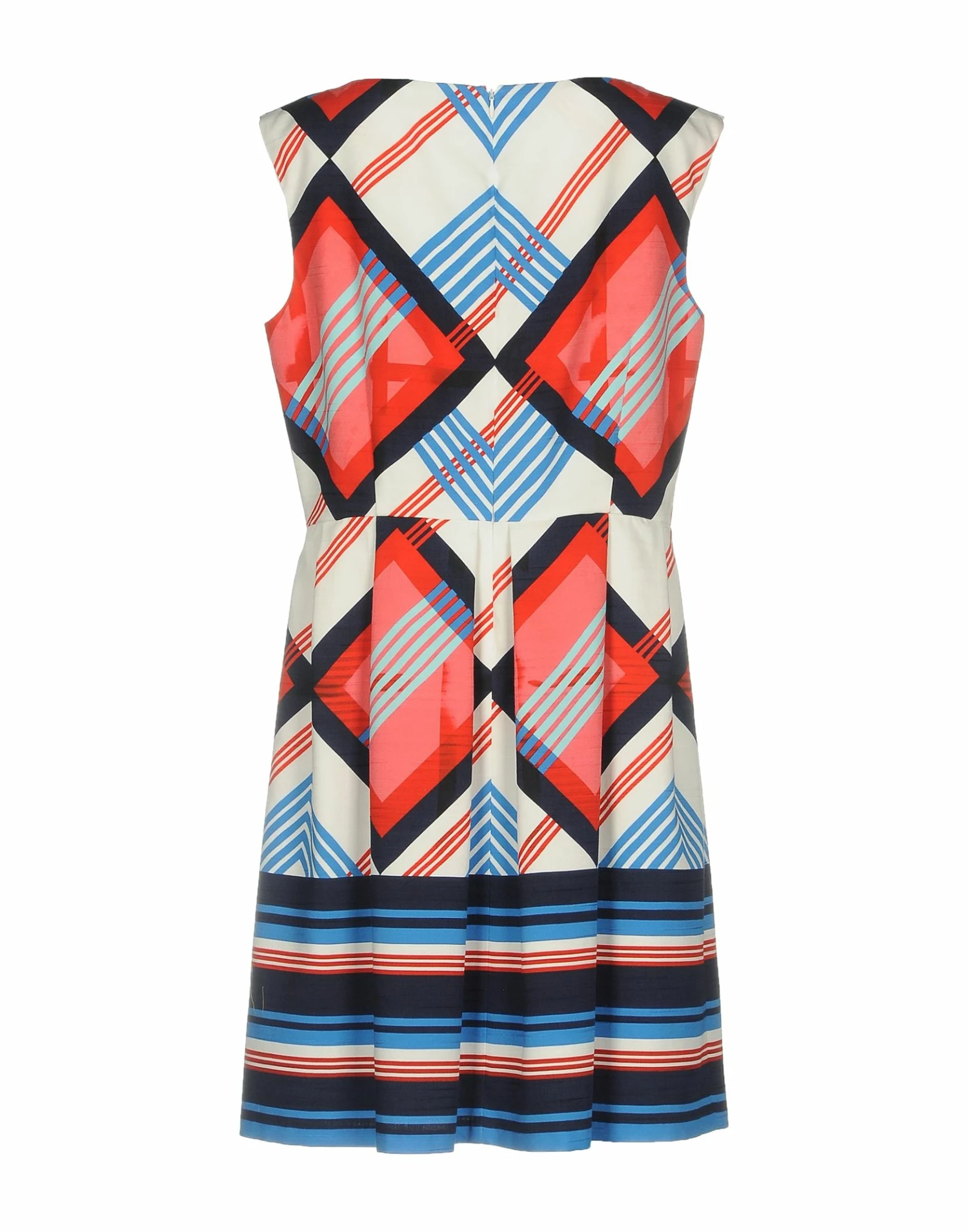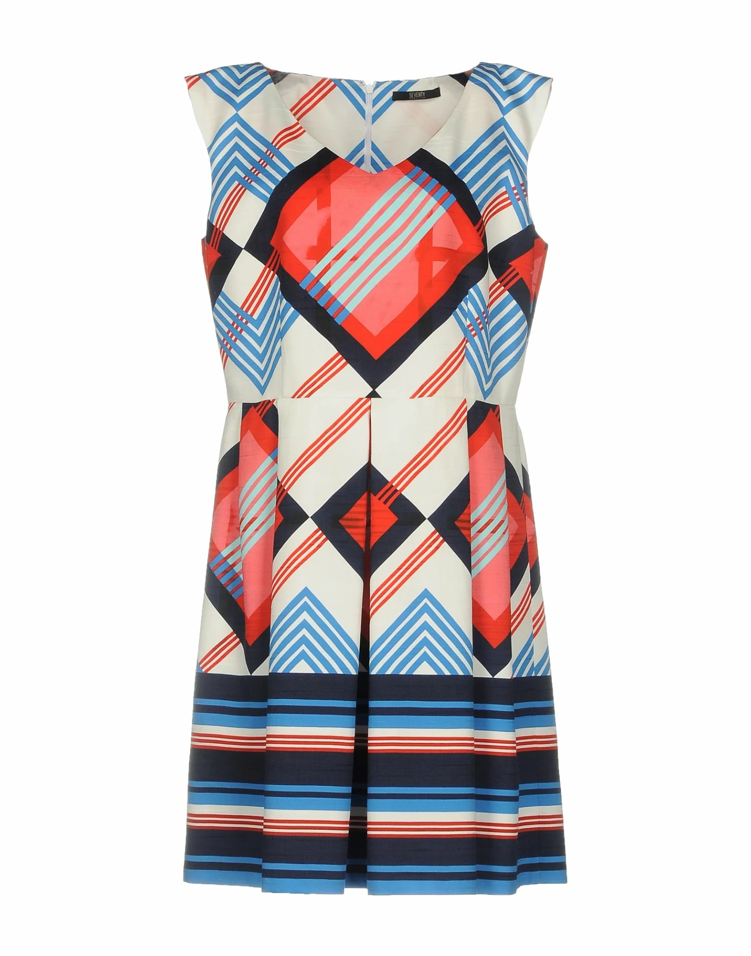jacquard, plain weave, no appliqués, multicolor pattern, v-neck, sleeveless, no pockets, fully lined, rear closure, zip, trapeze style