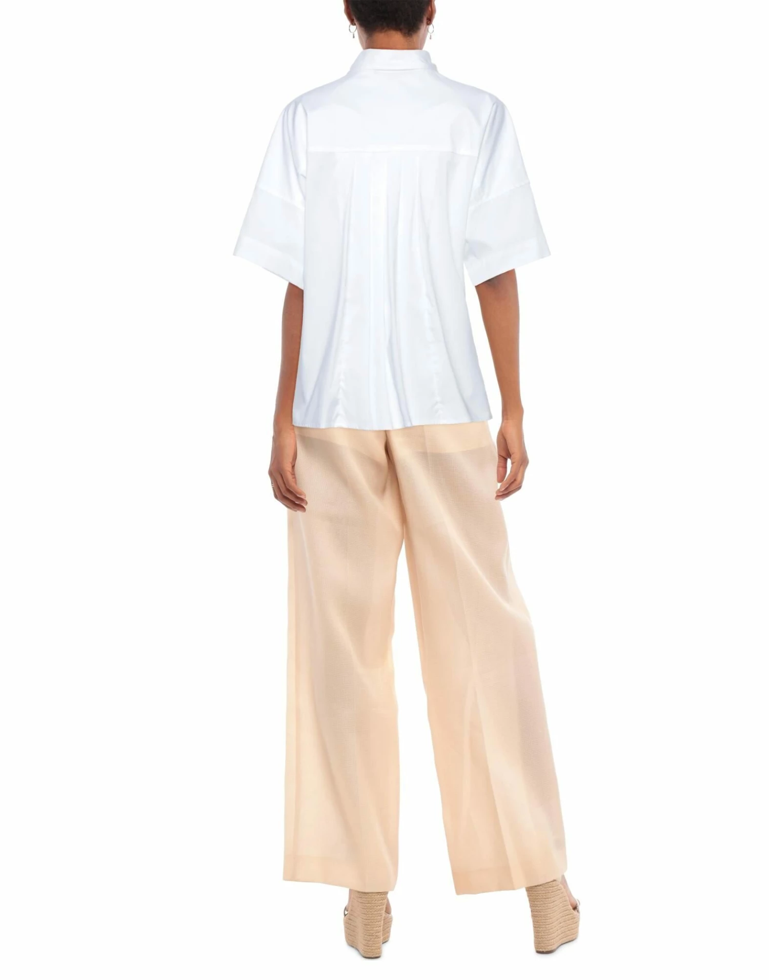 plain weave, no appliqués, solid color, classic neckline, short sleeves, button closing, no pockets, stretch
