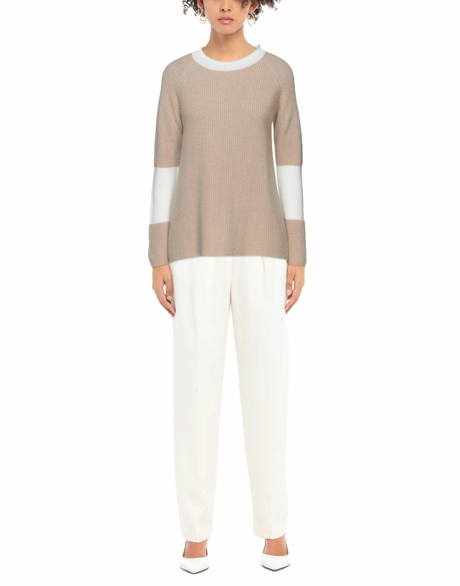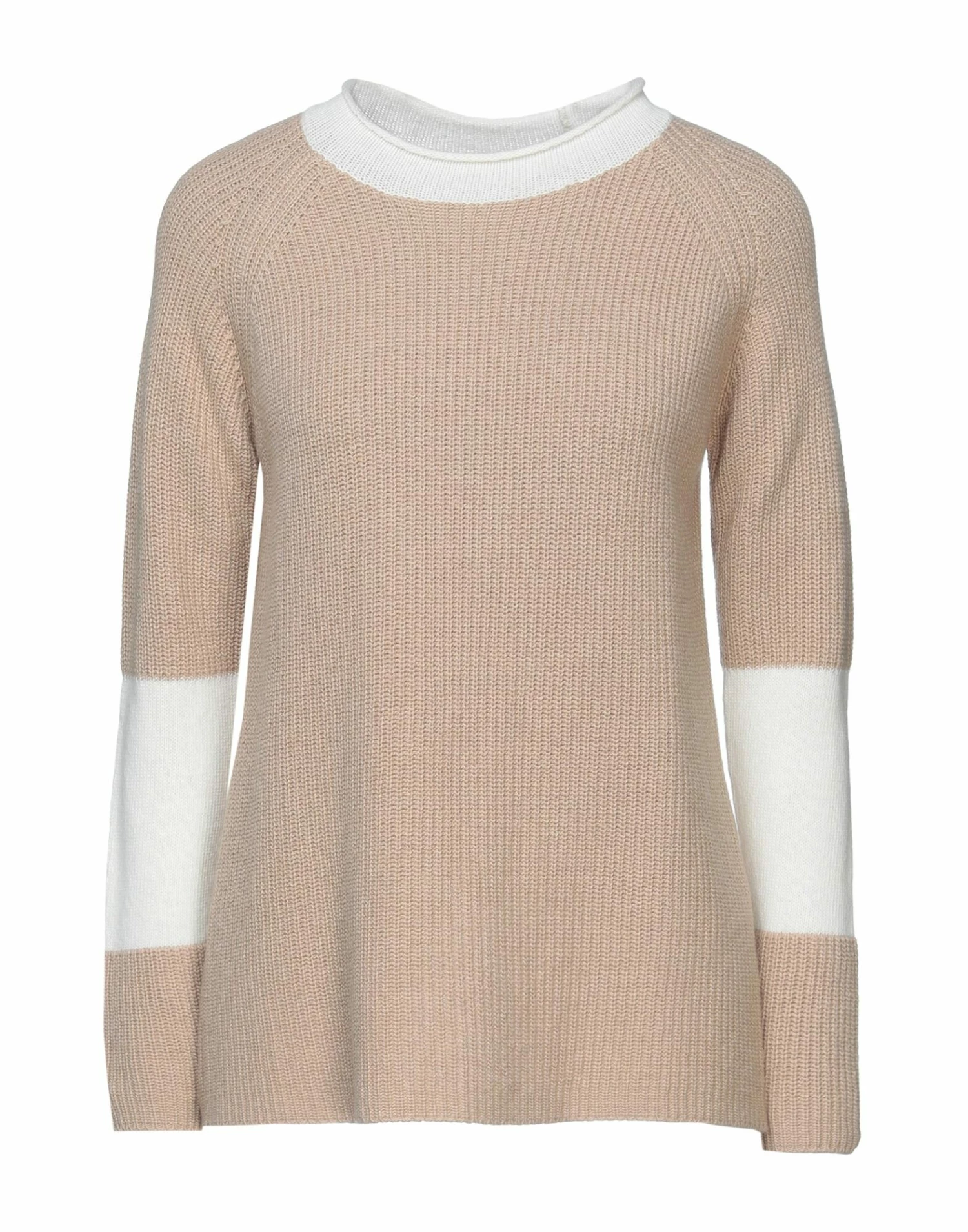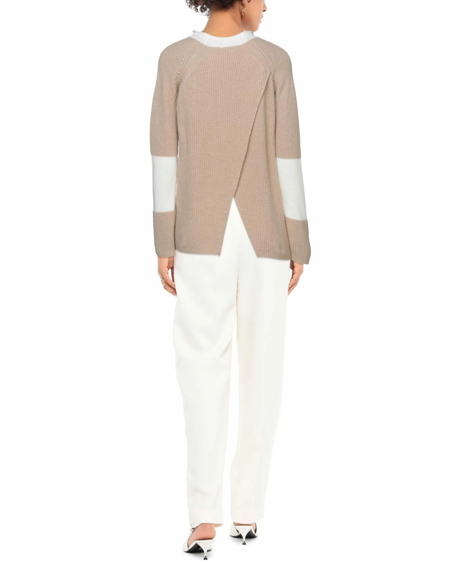 knitted, medium-weight knit, no appliqués, two-tone, round collar, long sleeves, no pockets, rear slit