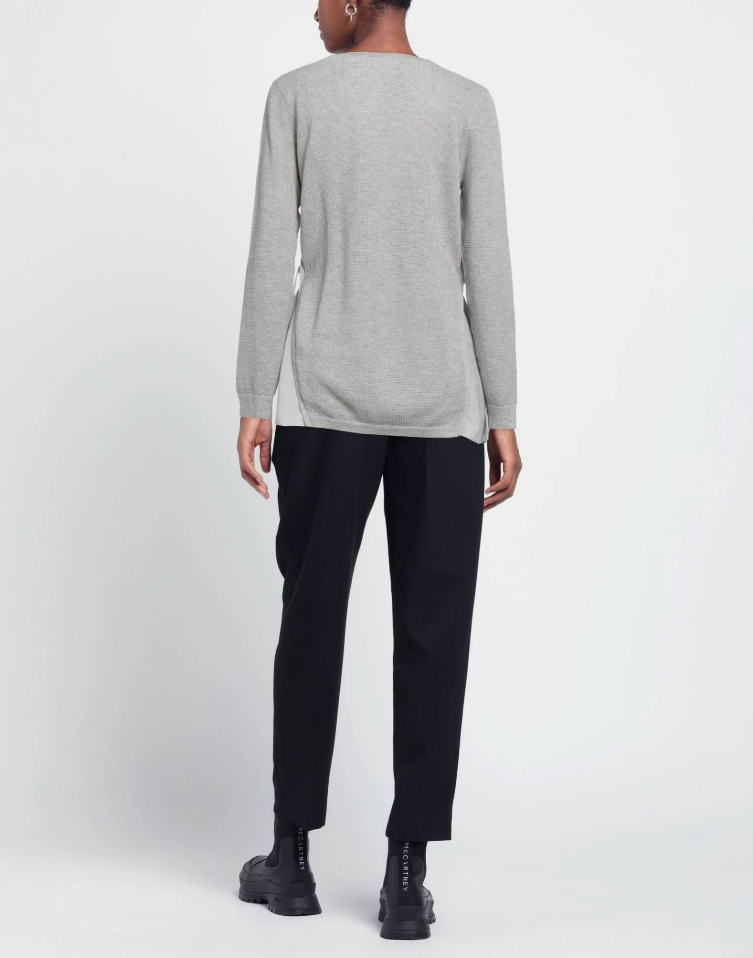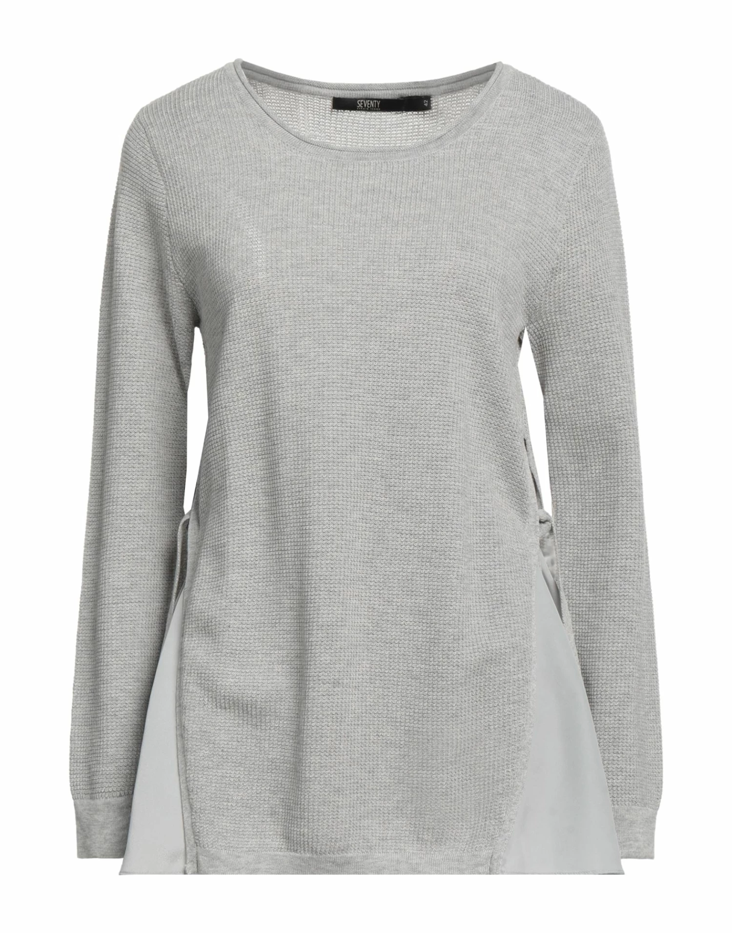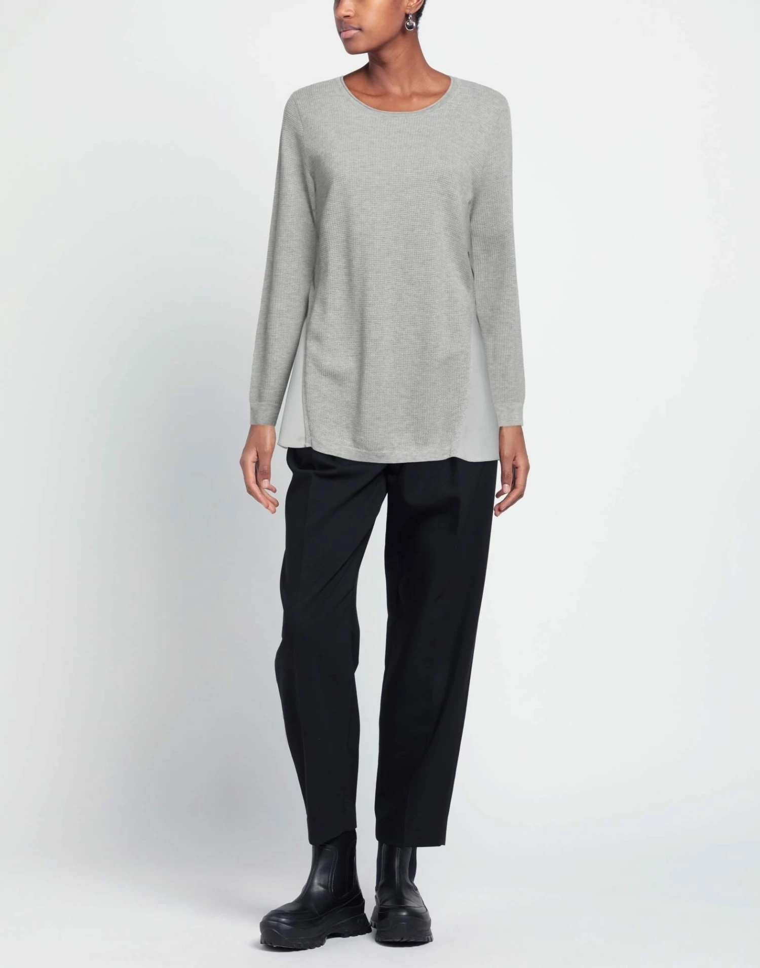 crepe, knitted, mélange, lightweight knit, no appliqués, solid color, round collar, long sleeves, self-tie closure, no pockets