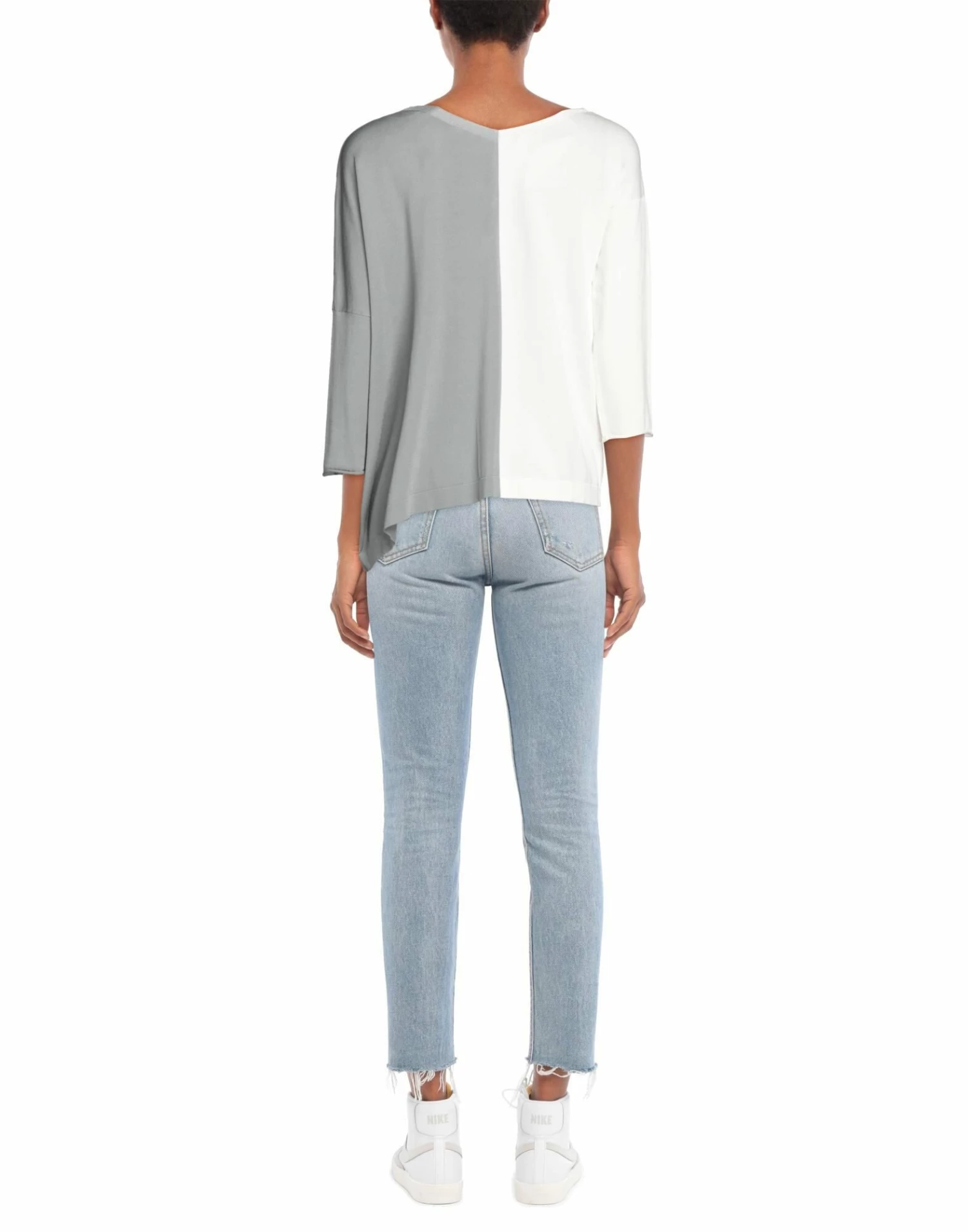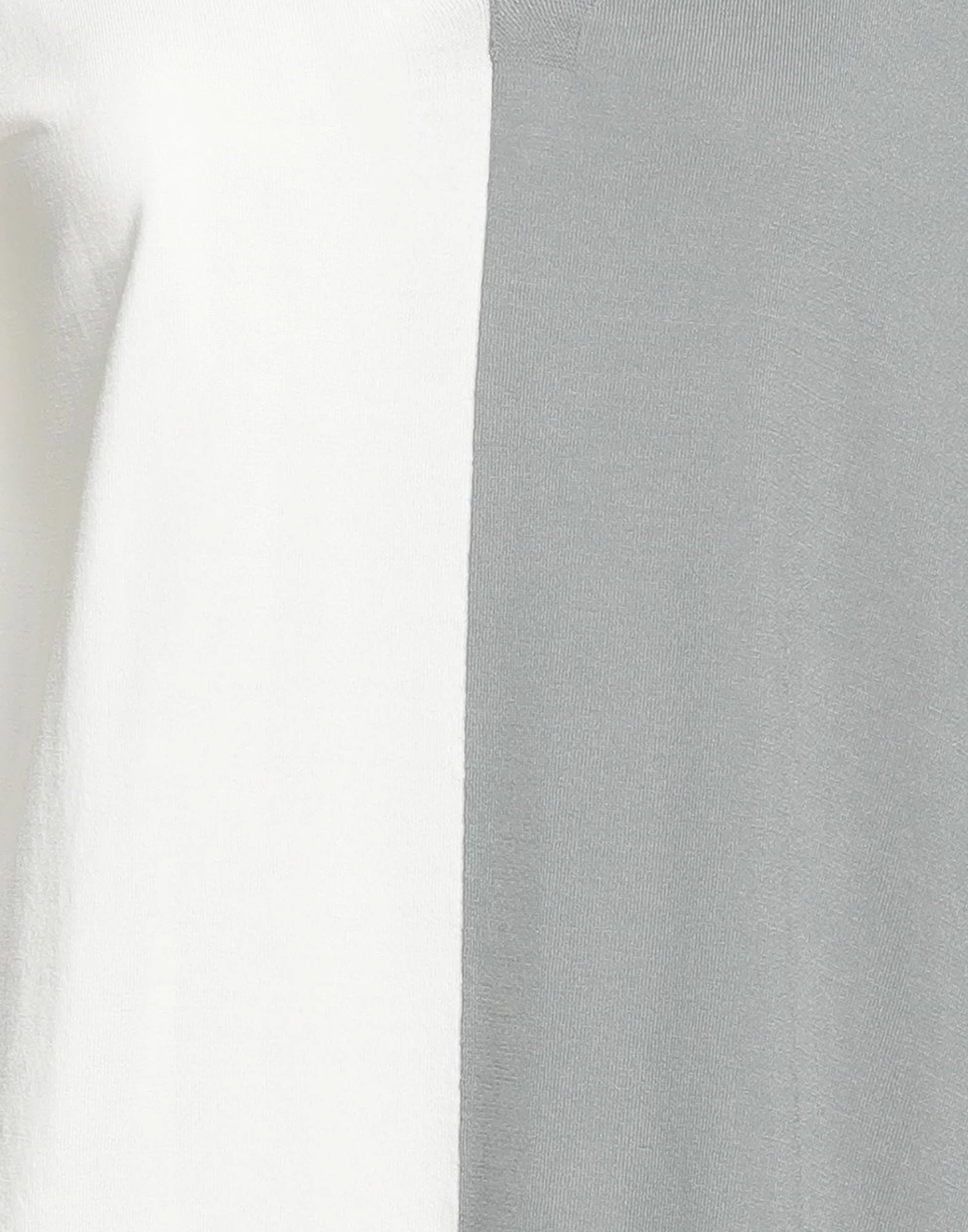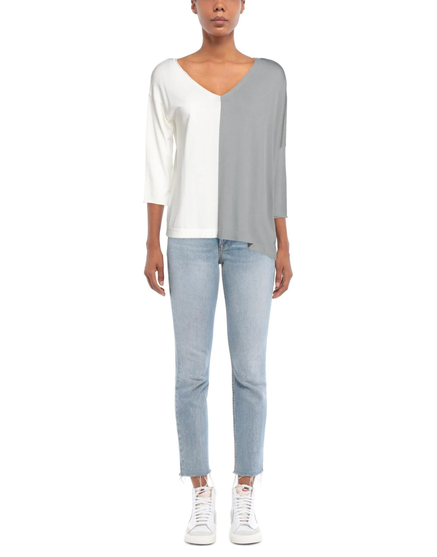 knitted, lightweight knit, no appliqués, two-tone, v-neck, 3/4 length sleeves, no pockets